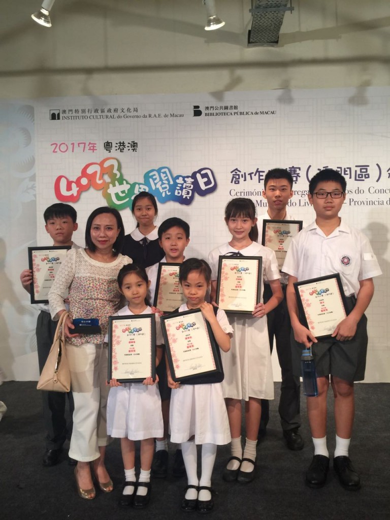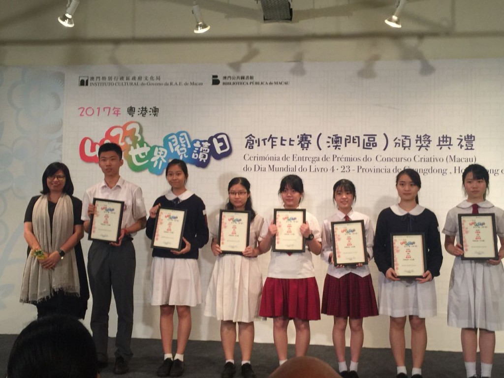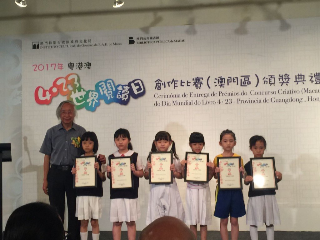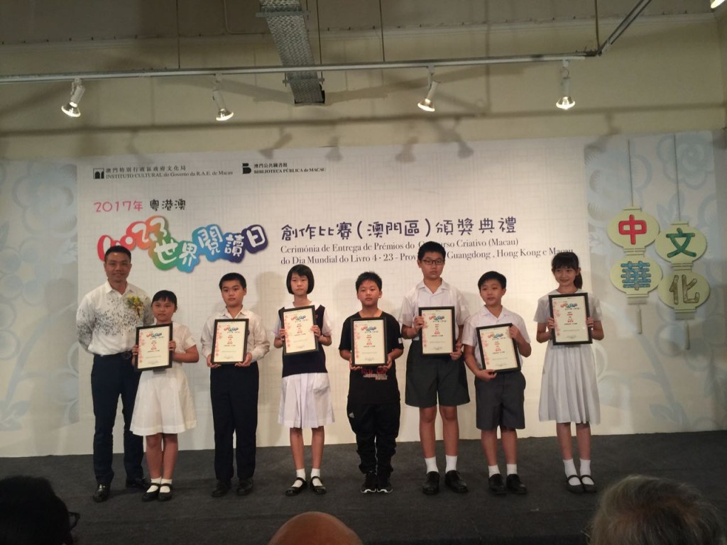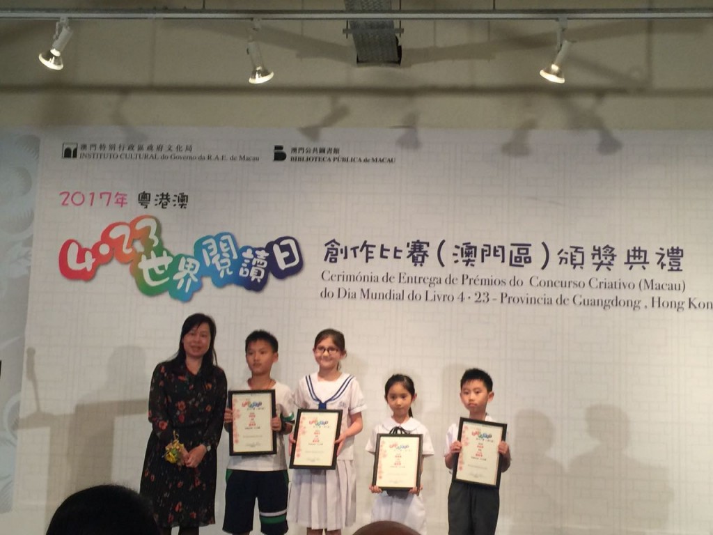 2017年粵港澳4.23世界閲讀日創作比賽(澳門區)頒獎典禮於今天舉行,本校陳俊康同學獲得高小組二等獎,獲優異獎同學包括:(初小組)鄧希悅、(中小組)趙康瑤、(高小組)蘇可瑜、麥嘉恩、何曉晴、何柏炘、韓冷、(高中組)黃亦韻、許穎心、鄒雨豪。