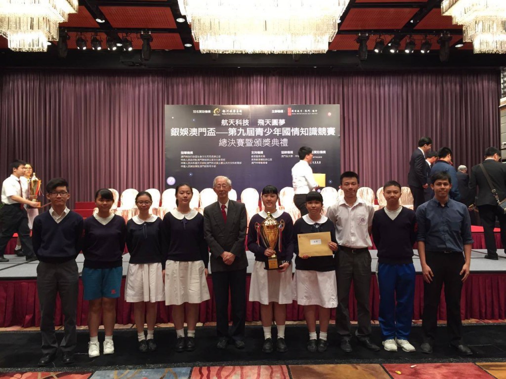本校高二級學生李綽楠、陳子筠、徐心暘,由譚達賢老師帶領,參加「銀娛澳門盃」第九屆澳門青少年國情知識競賽總決賽,獲中學A組亞軍。賽後與總評委楊允中博士合照留念。