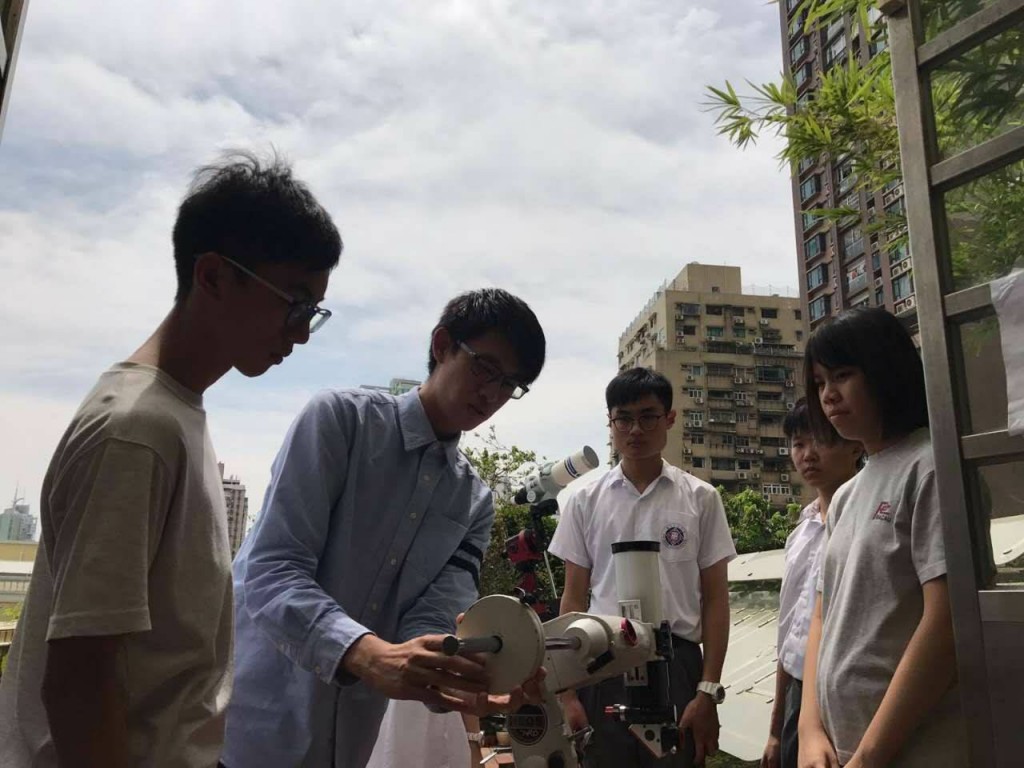 本校太空科研小組同學,於今天中午在曾玉金老師帶領下,進行太陽觀測活動。澳門科技大學黃子揚導師正為學生講解望遠鏡操作及原理等。同學將於本周六晚到路環進行觀星活動,共同探索星空奥秘。
