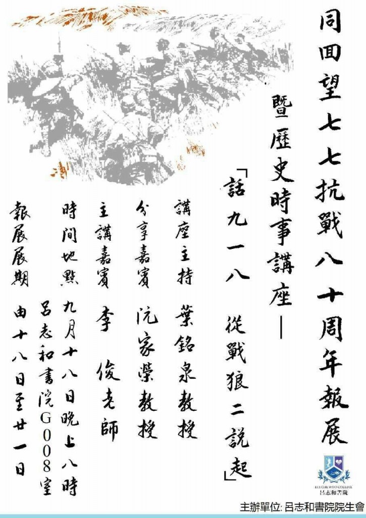 八十年過去了,中國從被列強欺壓走到今天的和平崛起,但居安思危,是一個民族成熟的表現,藉着紀念七七抗戰八十周年,本校與澳門大學呂志和書院再度合作,舉辦了「話九一八 從戰狼二說起」的歷史時事講座。本校歷史科主任李俊老師任是次講座之主講嘉賓,歡迎各界人士參與。