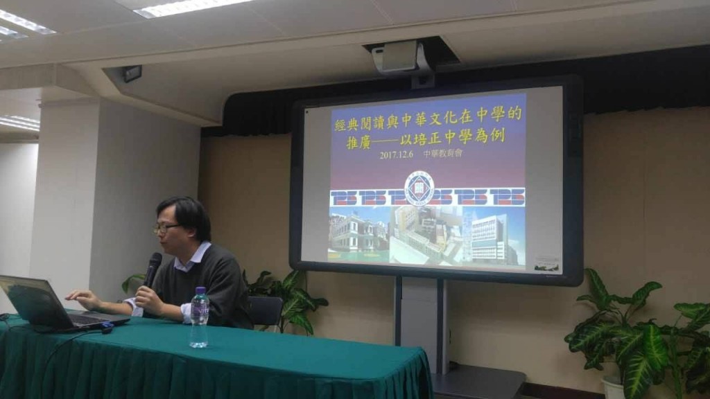 本校中華文化舘主管鍾春暉老師應中華教育會邀請,今日傍晚以“中華文化在學校傳承與推廣”為題,分享在學校如何透過經典導讀來推廣中華文化,讓與會之本澳教育工作者了解培正如何配合國家政策,培育愛國愛澳的人才。