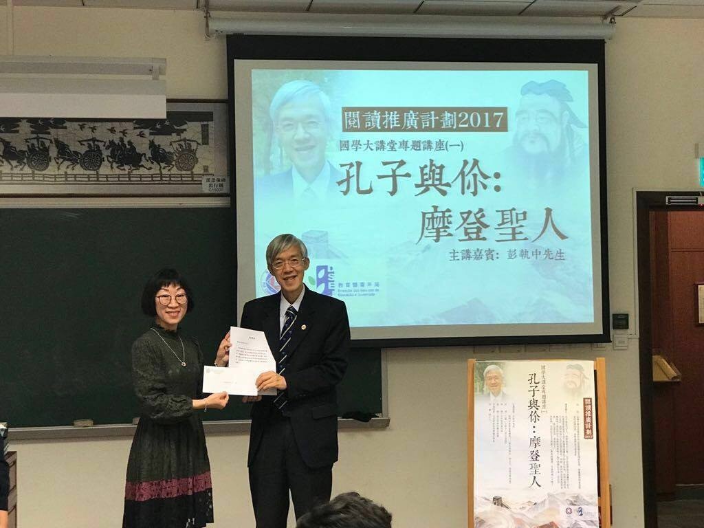 中華文化館及圖書館邀請澳門大學學生事務長、兒童文學作家,以及“開元故事法”的創立人彭執中先生為師生們主講國學大講堂第一場“摩登聖人:孔子與你”的閲讀專題講座。
