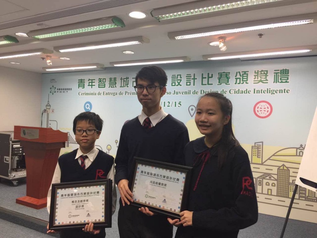由澳門智慧城市聯盟協會主辦之“青年智慧城市方案設計比賽”中,本校高一級徐延忠、劉蔚楠、霍靉雯三位同學獲得成品組優良獎,初一級許立知同學獲方案組優良獎及設計獎。