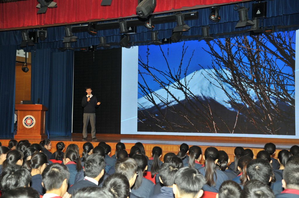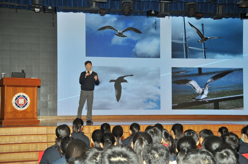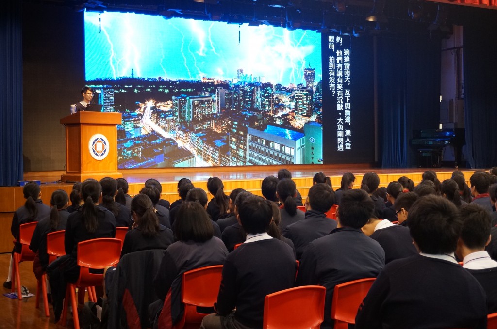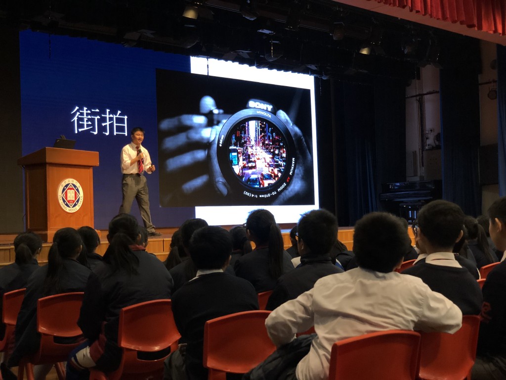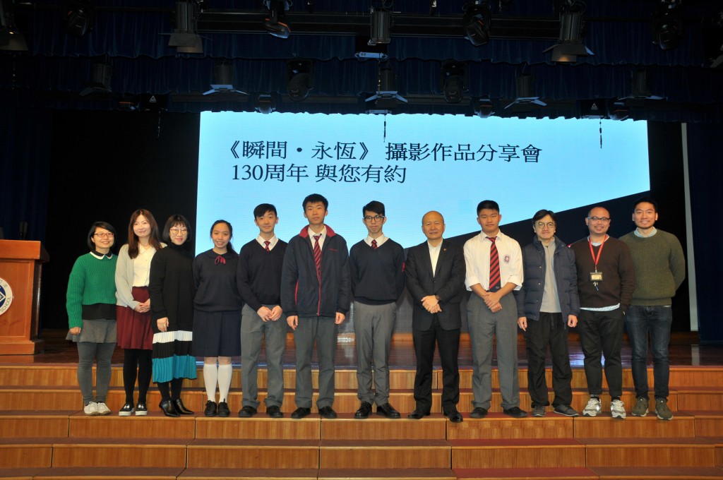 本校為推動全方位學習的大方向,讓藝術融入不同語言學習當中。由郭敬文副校長統籌中英文、視覺藝術科與圖書館跨科跨部門合作,於昨、今兩天周會上舉行「130周年與你有約『瞬間•永恆』攝影作品分享會」,邀請鄒雨豪、劉蔚楠、黃志龍、李瀚恩及徐延忠五位同學,分別採用中英雙語分享自己攝影創作的心路歷程。學校希望藉著分享平台,為學生提供一個展示才華的機會,並期望把學生累積的成果結集成冊,為130周年校慶做好前期徵集工作。