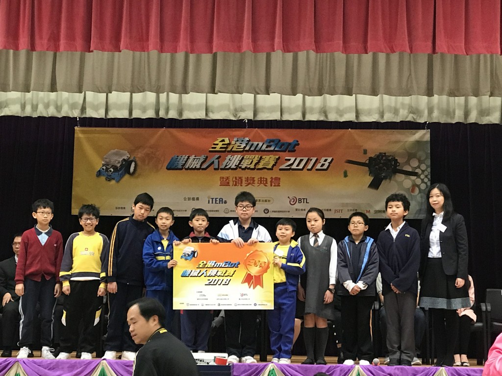 3月17日,由卓思出版社、圓心科技有限公司、香港資訊科技教育聯盟(ITEA)合辦之「全港mBot機械人挑戰賽2018」在香港舉行。本校小四林璟程同學、劉鍵楠同學、林晉毅同學獲得三等獎。該比賽為香港mBot機械人的大型比賽,參賽隊伍數目達一百隊以上。
