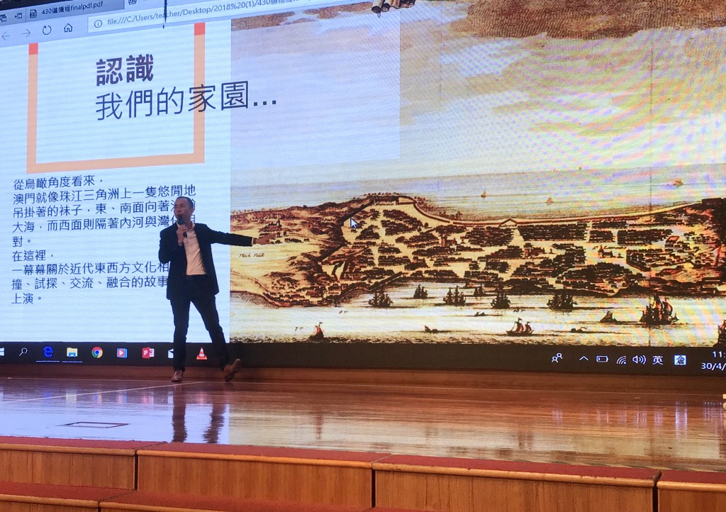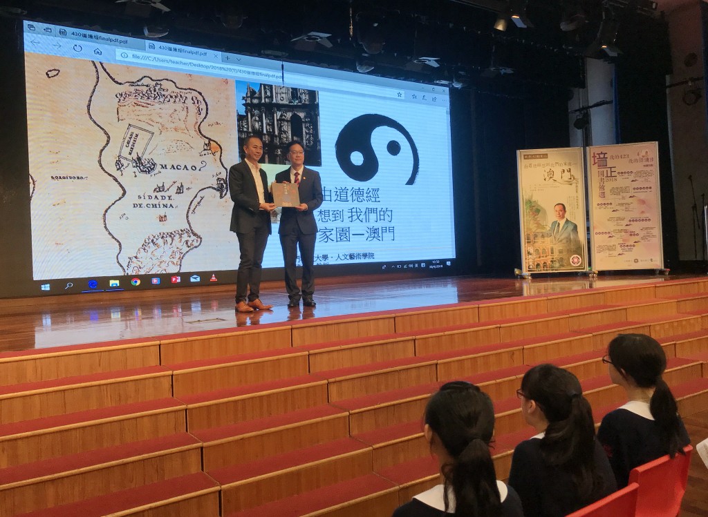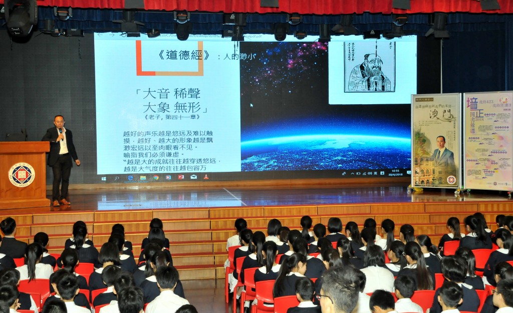 吳衛鳴博士以生動的例子向同學講述《道德經》中隱含的道理,接着又從《道德經》中「萬物負陰而抱陽」帶出我們熟悉的家園—澳門,他指出澳門十六世紀的地理輪廓乃至現今中西文化融合的表現,都與「負陰抱陽,沖氣為和」的思想有關。提起澳門這座小城,吳博士強調澳門城區的發展也有像記錄樹木生長一樣的「年輪」,只要平日細心觀察澳門的城區和街道,便能看出這座小城如何從小漁村,演變成現今中西文化匯聚的新面貌。