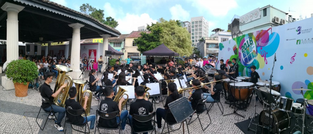 本校管樂團今天下午在氹仔嘉模墟參與教青局主辦的「校園樂繽紛」演出,樂團獻上名曲多首,不少市民及遊客駐足欣賞。