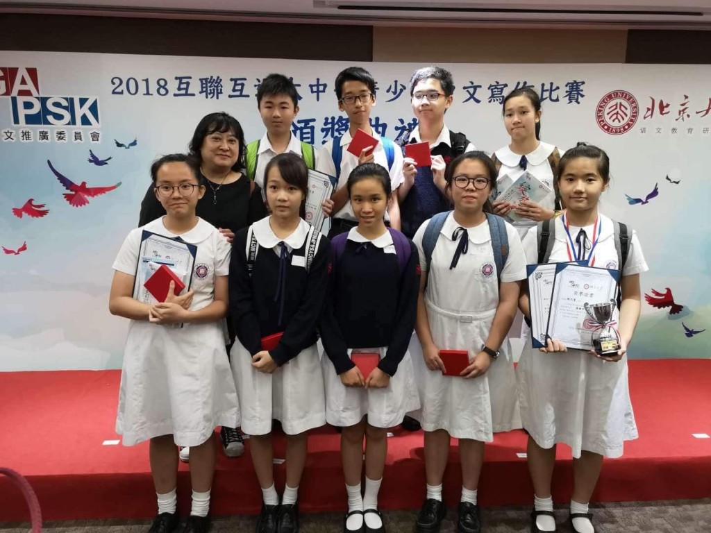 本校同學早前參加由北京大學語文教育研究所及香港GAPSK語文推廣委員會合辦的「互聯互通大中華青少年中文寫作比賽」,成績卓越,獲獎者眾,其中部分同學昨天往港出席頒獎典禮。小學組方愷瑤獲決賽銅獎,阮曉明、高譽愷、黃詩湲獲一等獎,鍾汶澄、陳穎希獲二等獎;中學組方鴻諭獲決賽銅獎,王丹怡、吳紀瑩、李樂彤、廖璟陶、楊琇煒、黎家豪獲一等獎,區梓丞、馬志明、盧屬靈、賴悅鋆獲二等獎。
