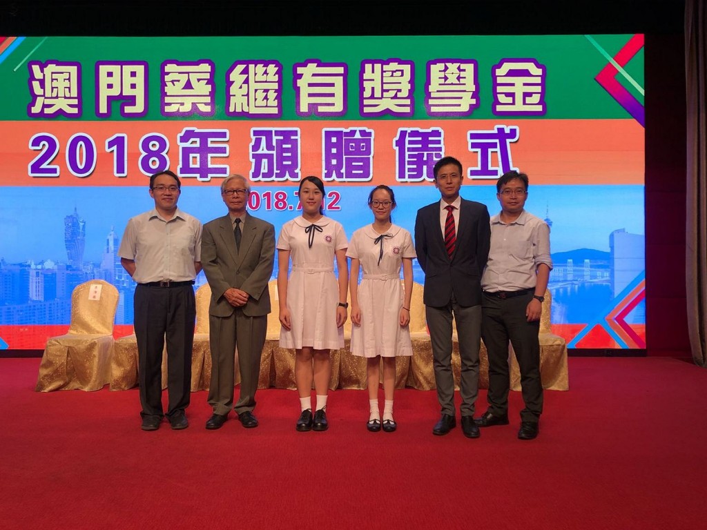 本校應屆高三畢業生陳子筠、黃靖琳分別獲清華大學、北京大學錄取,並獲頒蔡繼有獎學金,於今日下午由陳敬濂副校長、梅致常老師和薛展充老師陪同出席2018澳門蔡繼有獎學金頒贈儀式。