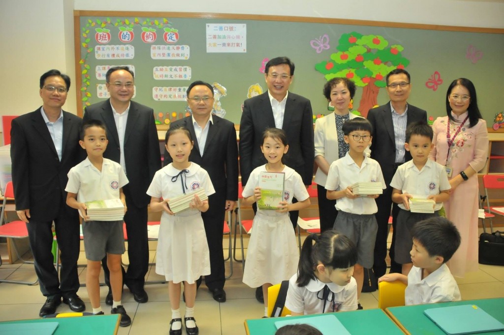 調研團先觀摩了一節小學中文教學活動課。學生在施虹冰老師引領下用粵語和普通話朗誦、吟唱兩首古詩,並積極與嘉賓互動。課後,嘉賓向學生代表贈書。