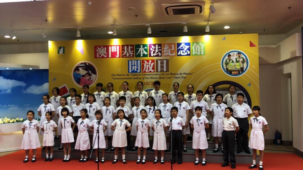 今早,本校小學合唱團應邀作為唯一表演隊伍,參加澳門基本法紀念館開放日開幕儀式表演,學生們為嘉賓及觀眾演唱了兩首具有中國特色的曲目,分別是《茉莉花》及《說唱臉譜》,同學們精彩的演出受到在場觀眾的一致讚賞,掌聲雷動!