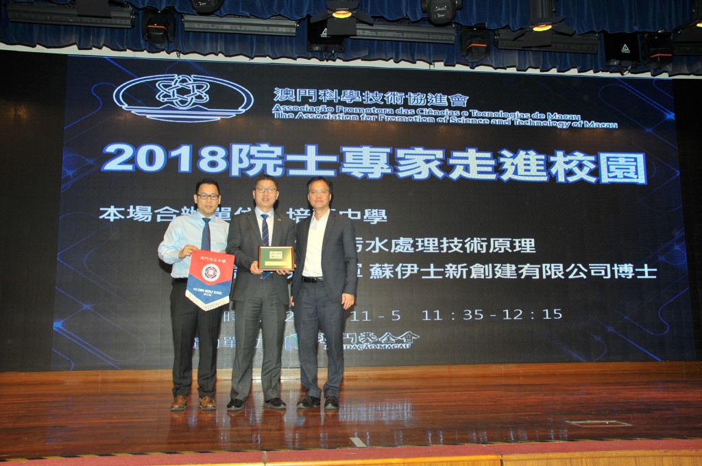 由澳門科學技術協進會主辦的「院士專家走進校園科普活動」今早在本校禮堂舉行,是次活動邀請了澳門自來水股份有限公司執行董事范曉軍博士,為初一、二級同學主持科普講座,並以「水和污水處理技術原理」為題,向師生分享世界淨水領域的技術應用,讓同學對污水處理技術的原理有更深入的認識,也啟發學生思考水資源日益短缺的問題。