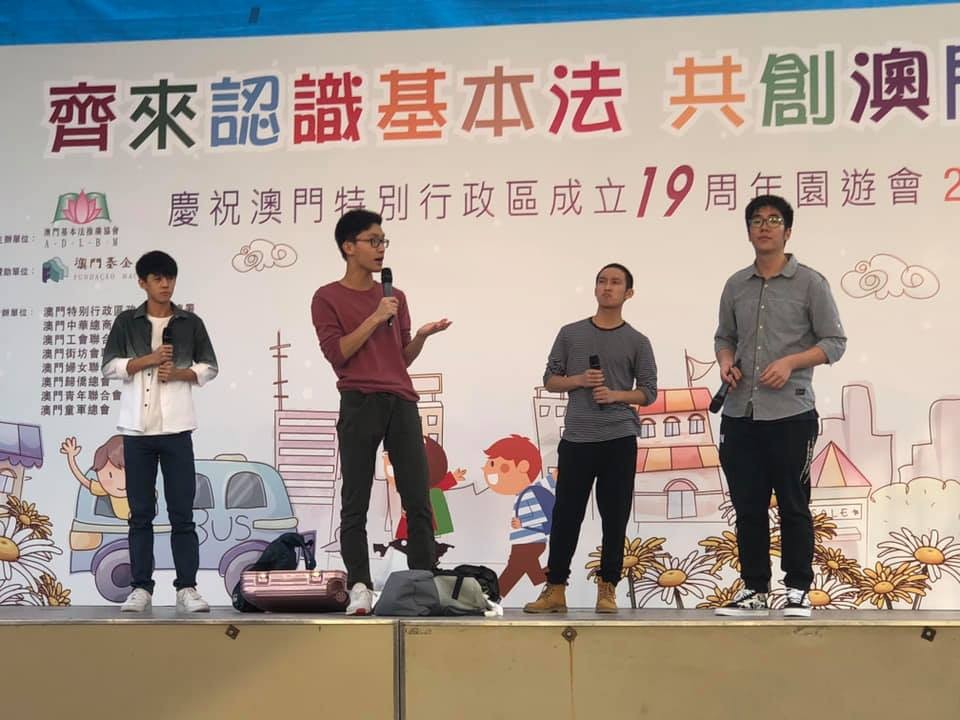 「齊來認識基本法 共創澳門好明天----慶祝澳門特區成立19周年園遊會」,今午於塔石廣場隆重舉行。澳門特別行政區政府、中央駐澳門特別行政區聯絡辦、外交公署等部門負責人出席並主禮,同時向多項比賽獲奬者頒獎。本校高二善班陶昶獲「基本法演示文稿PowerPoint設計比賽」第三名,鄧毅靜老師獲優秀指導教師奬;初三望班林芷愉、高三望班錢昊翔、林昆煥、劉肇希、張浚傑、羅昊燊、黃宇軒亦獲得「基本法宣傳短片創作比賽」優秀奬。