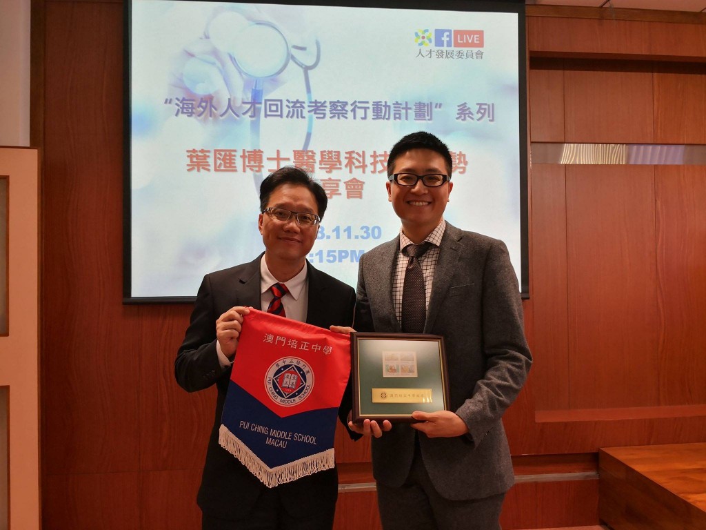 今午,本校慧社校友葉匯博士經澳門人才發展委員會安排,到校主持「醫學科技新趨勢」分享會,與一眾師生分享其在美國的求學經歷及介紹醫學上的科技新應用。