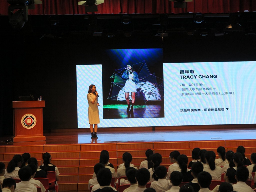 今早,驁社校友曾穎璇回校主持初一、二級周會,向一眾學弟妹分享她在音樂路上的追夢歷程。