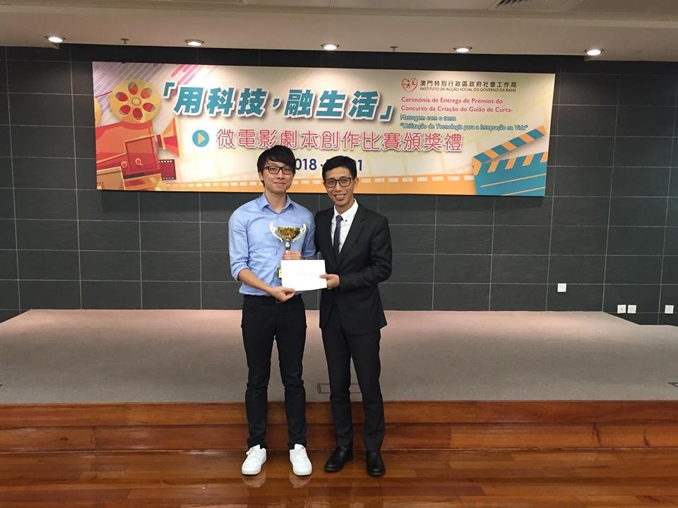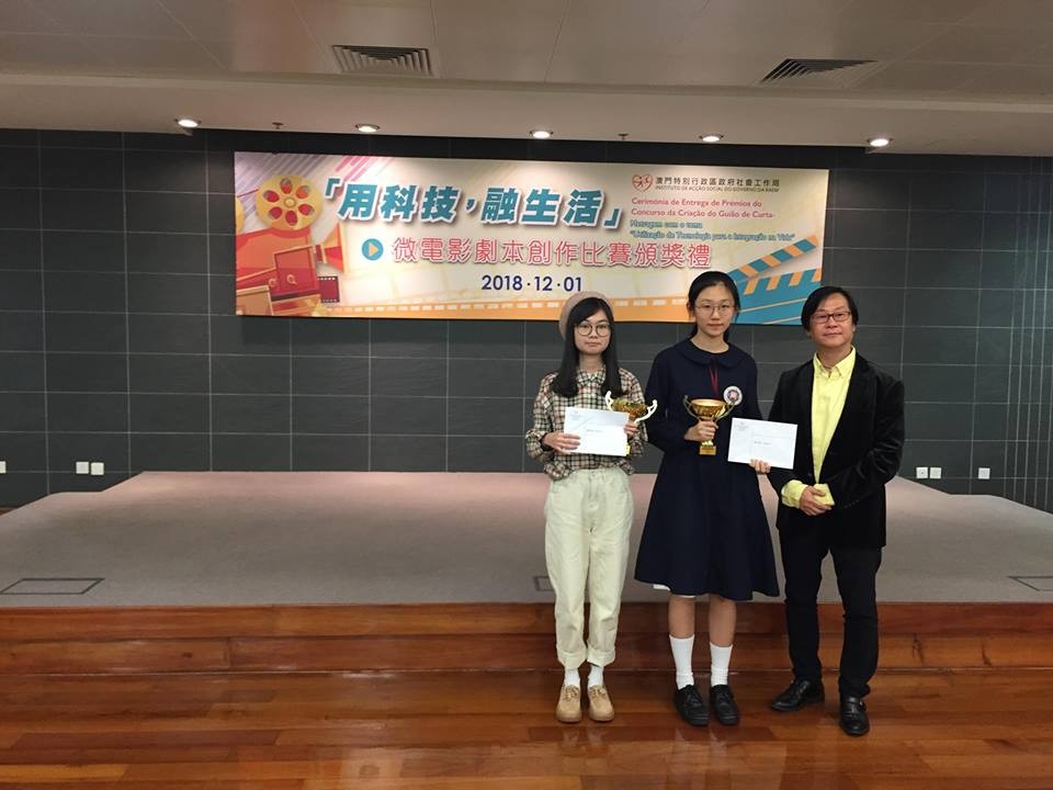 由社會工作局所舉辦的「用科技,融生活」微電影劇本創作比賽,12月1日下午於民政總處下環活動中心舉行頒獎禮。大會於是次比賽共收到42份作品,最後由本台導師黃耀鋒老師與本台台長高三信李瀚恩合力撰寫的劇本勇奪冠軍,此劇本以英國高中生Easton LaChappelle的真人真事進行改編。而高三正張灝鈞憑作品<<不再>>獲季軍,高三正吳雪怡憑作品<<形色>>獲優異獎,季軍及優異獎是由郭艷玲老師及戴碧筠老師共同指導。