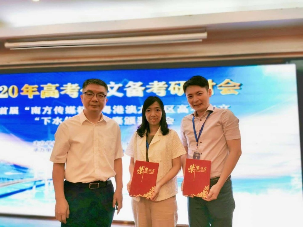 本校中學中文科主任麥芷琪老師、張柏恩老師參加由南方出版傳媒股份有限公司主辦的2020年高考作文備考研討會暨「首屆南方傳媒盃粵港澳大灣區高考作文下水作文」大賽頒獎典禮。下水作文大賽共有1640位教師參加,最後評出特等獎12篇,一等獎67篇,二等獎140篇,三等獎183篇,麥芷琪老師獲一等獎,張柏恩老師獲三等獎。南方出版傳媒花城出版社把特等獎、一等獎作品結集出版《大灣衝浪:名師同寫高考作文2019》,為學生提供寫作門徑。頒獎儀式上,廣東南方出版傳媒教材經營有限公司副總經理吳志海與麥芷琪老師、張柏恩老師合影。