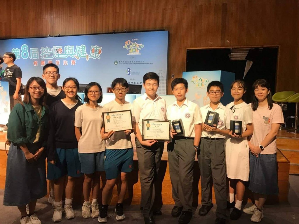 「第8屆控煙與健康校際問答比賽」今天舉行,來自本澳及大灣區二十多間學校共56支隊伍參加。經過激烈的比賽,本校迎難而上隊伍(林碧怡、梁雅姿、區柏豪、張証然)獲得優異奬,哈哈哈哈哈隊伍(張若詩、黃浩政、翟夏木、譚貯文)獲得最具創意奬。