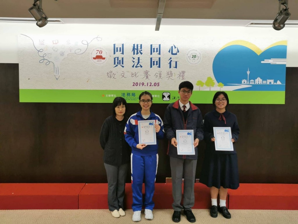 本校同學參加由法務局主辦的「同根同心‧與法同行」徵文比賽,高三望聶穎君、高一望饒思琪、高一愛徐翊同今天出席頒獎典禮,獲頒優異獎。