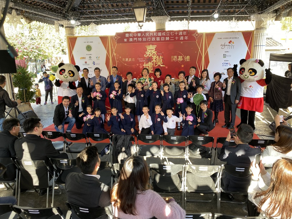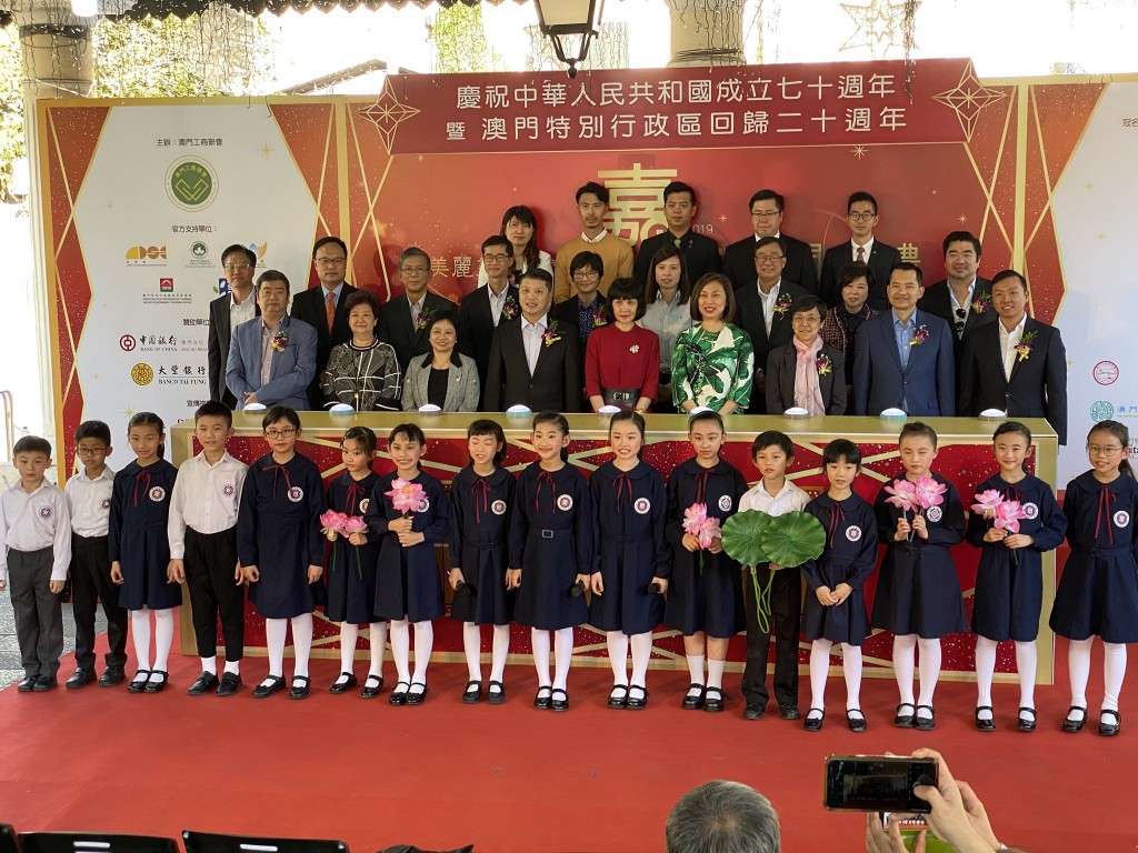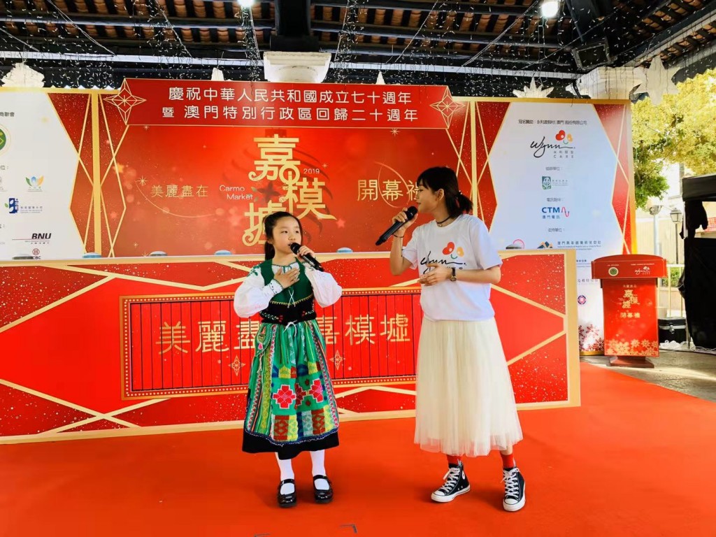 今天下午,小Sing星合唱團的16位團員受澳門工商聯會邀請,於氹仔舊城區嘉模墟參加“2019美麗盡在嘉模墟”開幕禮。活動中,小朋友們演出了具本土特色的葡語兒歌及土風舞,並為大家演唱澳門回歸祖國的主題曲《七子之歌》,壓軸節目由合唱團代表小四級同學沈靜柔與澳門歌手陳慧敏一起演唱《我和我的祖國》,將整個開幕典禮推向高潮。同學們精采的表演,可愛的表情,認真的態度,都獲得在場嘉賓及觀眾們一致好評。高錦輝校長及郭敬文副校長特別到場支持,對同學們的表現讚賞有嘉。