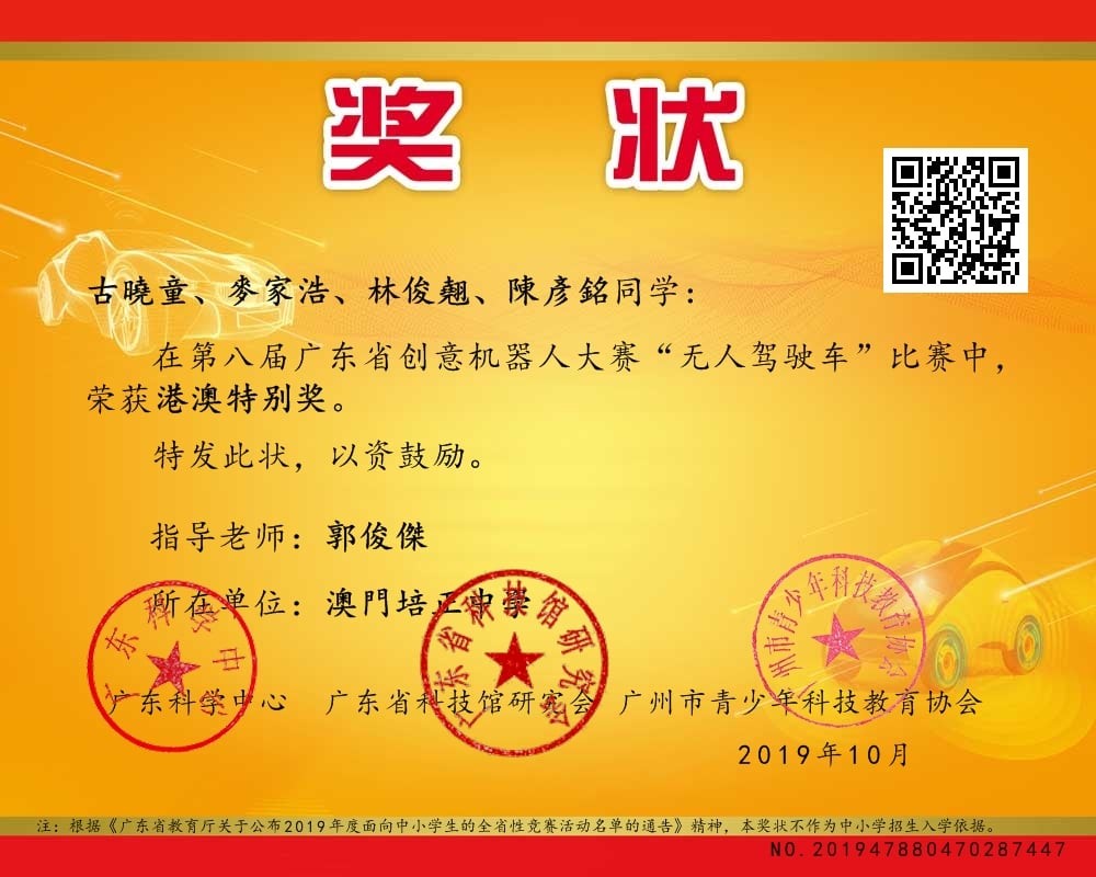 由廣東科學中舉辦之「2020廣東省創意機器人大賽」中,本校中學組學生古曉童、林俊翹、陳彥銘、麥家浩參加了「基礎組」中學組比賽。小學組梁志美彭焯謙、布晞彤參加了「基礎組」小學組比賽。本次比賽分為「基礎組」及「編程組」,「基礎組」是要求參賽學生根據比賽場地,組合一邏輯電路組成一臺可巡線行走之機械人,而「編程組」要求參賽學生為控制板編寫程式進行巡線。兩組學生皆在本次賽事中獲得「港澳特別獎」。
