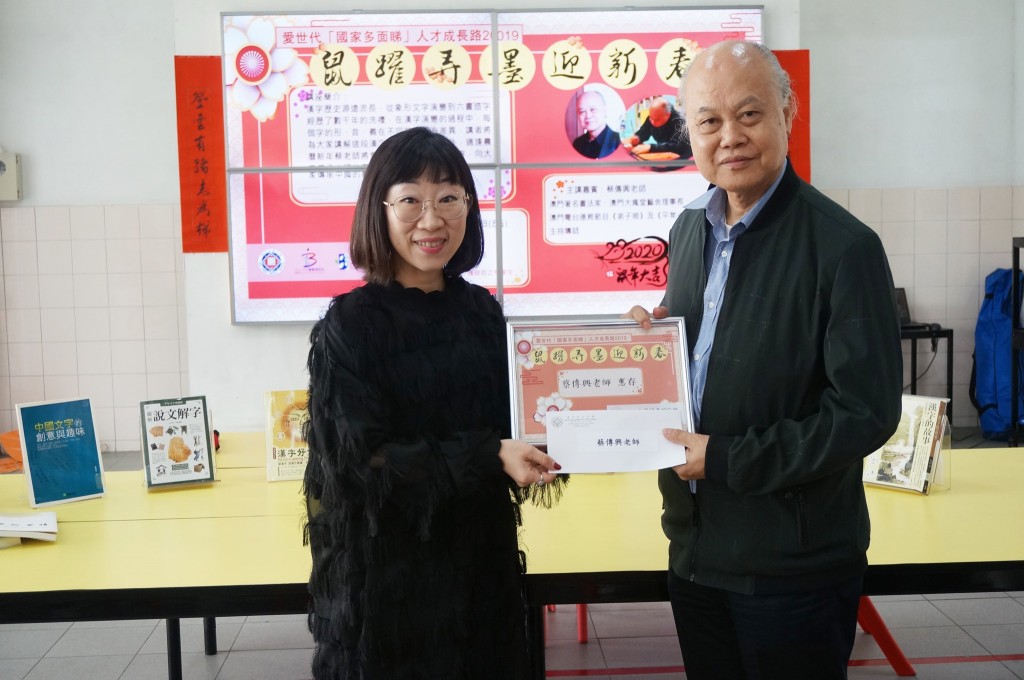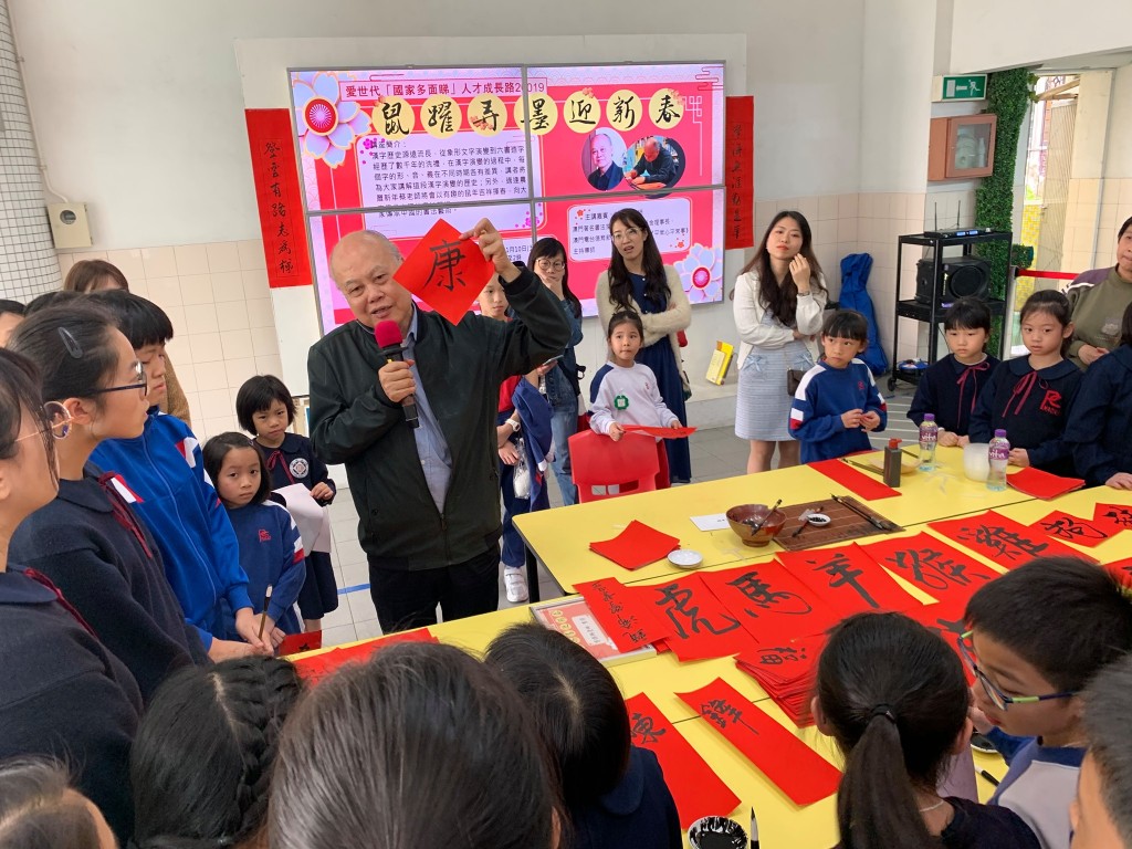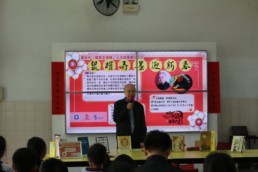 圖書館在今日中午舉辦「鼠躍弄墨迎新春」活動,邀請本澳著名書法家、澳門大瘋堂藝舍理事長蔡傳興老師向師生家長講解漢字演變的歷史,加深大家對中國傳統文化的認識。