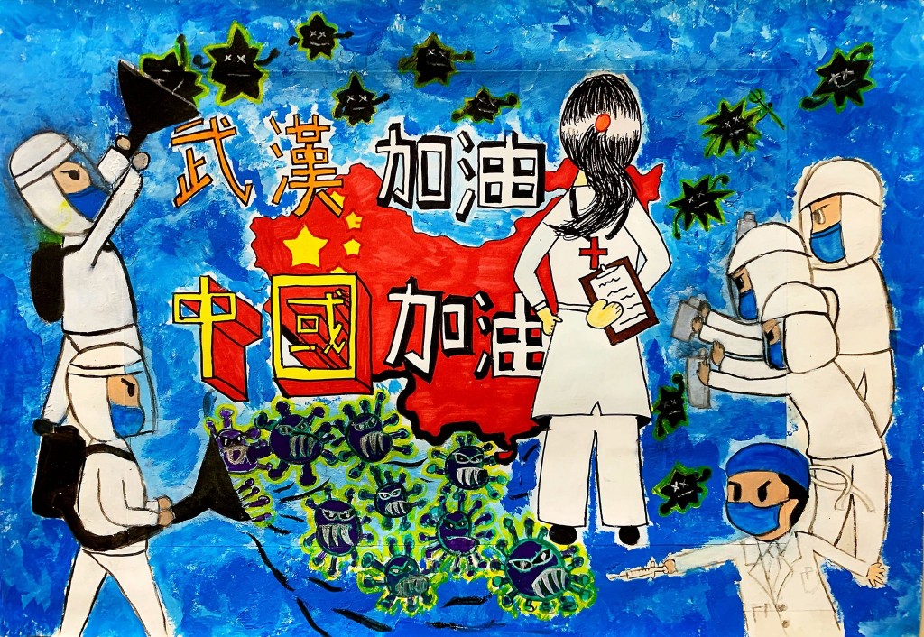 孩子以畫言志,以畫傳情,在線上聲援抗疫,傳遞大愛,喊出了「武漢加油,中國加油」的心聲,表達了孩子對最美逆行者的敬仰和讚美,以上作品指導老師為黃慧儀。