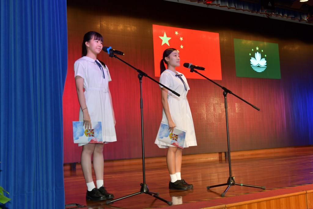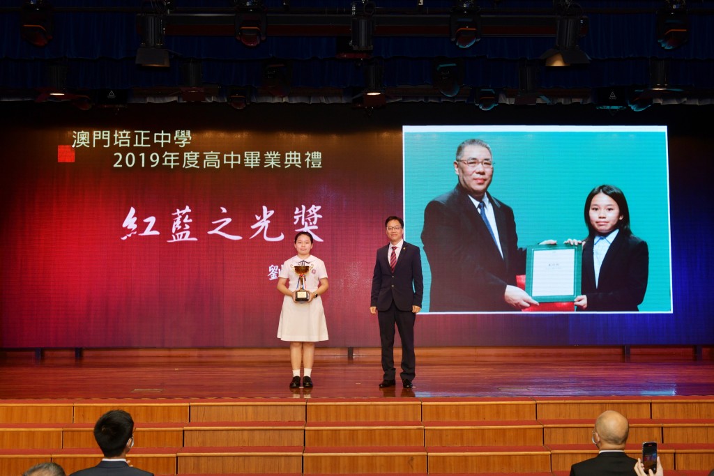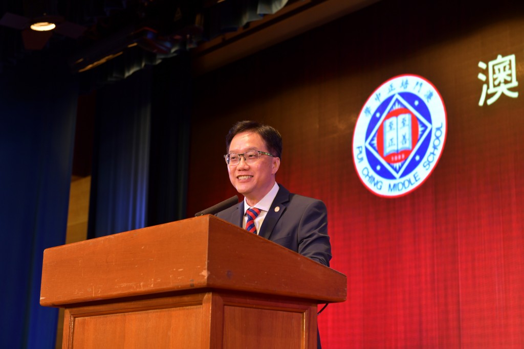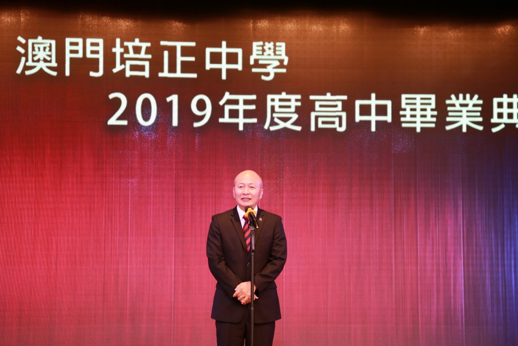 高校長表示,培正中學致力發展優質教育,長期以來本校高三畢業生升學率保持百分之一百,其中有免試進入北京大學、清華大學、復旦大學等一流院校的保送生,大約百分之十獲世界排名頭三十之大學錄取或有條件錄取。二○一九年是本校創校一百三十周年,他感恩大部分關於校慶活動已經順利完成,同時感謝過去一年在政府支持,辦學團體領導下,教職員工上下一心,校友及愛護培正人士關愛,家長配合及學生努力下,造就了澳門培正經歷不平凡的一年。高校長提及去年教師節國家教育部在北京召開「慶祝2019年教師節暨全國教育系統先進集體和先進個人表彰大會」,國家級教學成果獎亦同場頒發,國家主席習近平、國務院總理李克強等均有出席。本校以《新時代下萬眾創新理念落戶基礎教育——澳門培正中學STEAM融入正規課程之實踐與推廣》在全國中亦是唯一以STEAM為題而獲一等獎,成績卓越,為澳門教育寫下歷史一筆。本校與中國銀行澳門分行共同建立智慧金融推廣中心,開展與經濟範疇相關的活動及課程,把智慧金融的理念推廣到校園。為響應國家《新一代人工智能發展規劃》,及配合特區政府打造智慧城市的理念,建設智慧校園,本校與商湯科技有限公司及光聯世紀科技有限公司簽署合作協議,在中小學階段引入人工智能課程,從理論普及到技術應用層面逐步發展,也將跟CTM簽5G應用合作意向書,5G將覆蓋全校園,優化教學工作。以上這些合作都是開澳門非高等教育的先河。本校兩隊國際科學與工程大獎賽(ISEF)參賽獲獎隊伍、簡易判斷學生近視的主覺驗光儀參賽獲獎隊伍、以及有同學在全國青少年科技創新大賽參賽獲獎最高獎項,均於去年11月榮獲澳門特區政府功績獎狀。他勉勵同學把握時代脈搏,在征途上堅定前行,在激流中奮勇邁進,逆流而上。