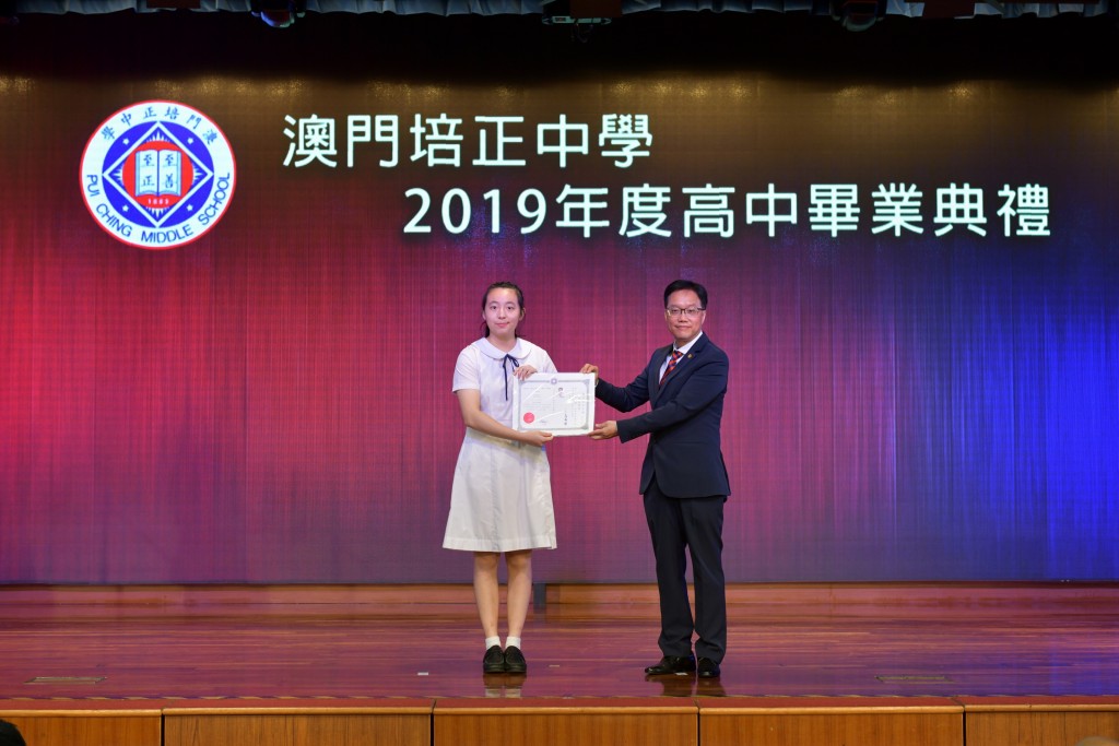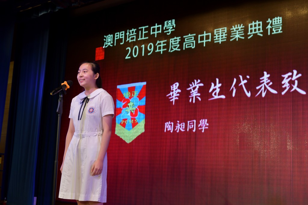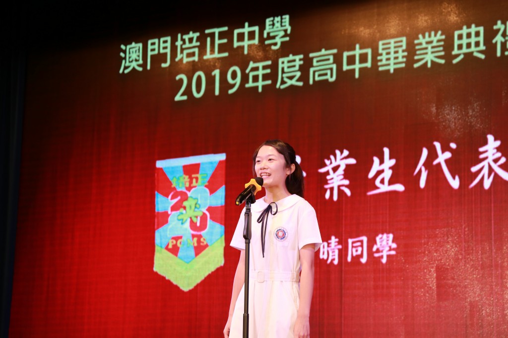 受新型冠狀病毒疫情影響,澳門培正中學按衛生局指引及在各項完備的防疫措施準備下,二○一九年度高中畢業典禮今天分別於上午九時三十分及下午三時在本校禮堂隆重舉行文組及文理組、理組畢業典禮,全級共一百九十六位奕社高三學生畢業,畢業典禮氣氛莊重熱烈,校長、主任、老師及家長見證同學們畢業的珍貴時刻。