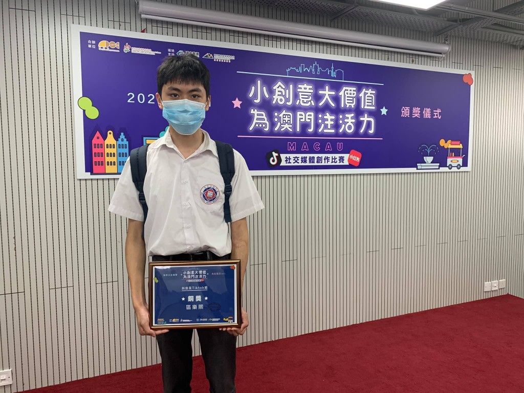 高二望班區樂熙同學參加由經濟局、澳門中華新青年協會合辦的「小創意大價值,為澳門注活力」社交媒體創作比賽,以短片「藏匿於澳門街角的新式土生葡菜」獲得抖音及TikTok組銅獎。
