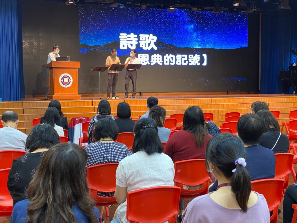 在昨天的教職員靈修會上,劉天亮老師(1985博社)、校友沈世傑傳道(2002亮社)、校友鄭兆威傳道(1999樂社)及鄭傳道的太太陳翠華傳道一起分享詩歌,劉天亮老師亦分享有些老師如何在他生命中影響他信耶穌的見証;校友梁月玲傳道(1982駿社)也引用馬太福音13:1-9、18-23撒種的比喻與教職員分享結果子的生命,讓老師們明白上帝如何幫助人過豐盛的生命。