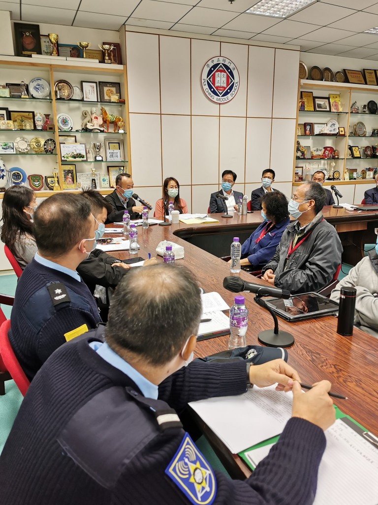 教青局、警察總局、治安警察局向全澳學校組織可疑人物闖入校園演練。今早,當局人員來校,了解本校制訂的 “防範封鎖” 措施,通過桌上演練,強化員工應對突發事件的意識及能力。