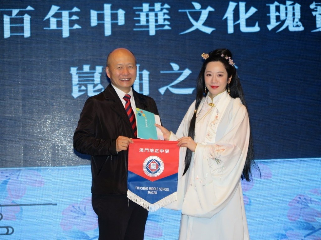 今日早上,澳門中華崑曲文化協會大會主席、粵港澳大灣區青年總會副主席及澳門區主席李卉茵博士來到母校培正中學禮堂,在郭敬文副校長致贈本校校旗及出版刊物《紅藍蕙風》紀念品後,開始講演「四百年來中華文化瑰寶崑曲之美」。