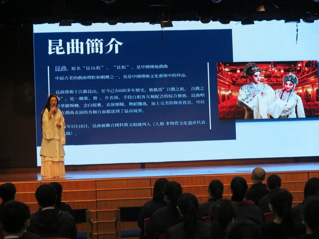 崑曲,是中國戲曲的劇種之一,發源於元末明初的蘇州府崑山縣,形成精緻的藝術規範,影響所有後出之地方劇種,有「百戲之母」美譽,李卉茵博士一邊娓娓說著,一邊同時示範介紹自己身為崑曲旦角常穿之戲服。現場亦播放澳門世遺版《夢影•牡丹亭》崑話劇的專訪片段,與學生們分享她當年如何從一位文藝青年、轉變到崑曲愛好者,到身體力行,向世界推廣崑曲的故事──代表澳門登上央視戲曲晚會舞台、到塞浦路斯表演、為到訪的摩納哥王妃演出……,青春版《牡丹亭》推動者白先勇老師口中的那顆「種在澳門的崑曲種子」已隨著回歸二十年發芽成長。