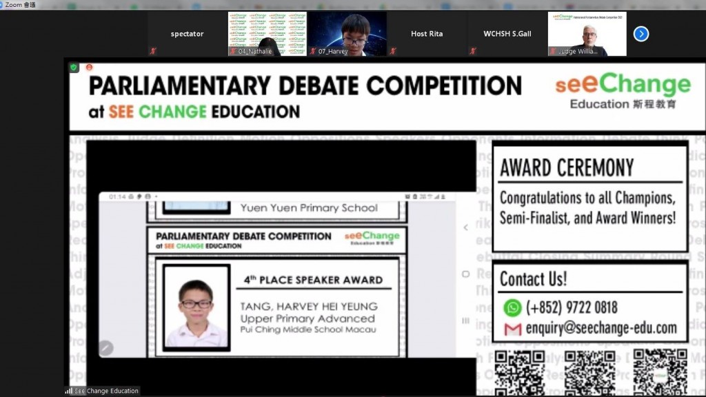 由香港斯程教育舉辦的國際辯論比賽準決賽今天上午於線上舉行,小六正班鍾天健及小六善班鄧希洋同學代表本校出賽,表現優秀。鄧希洋同學更憑其突出的表現,奪得「演講者奬」第四名。