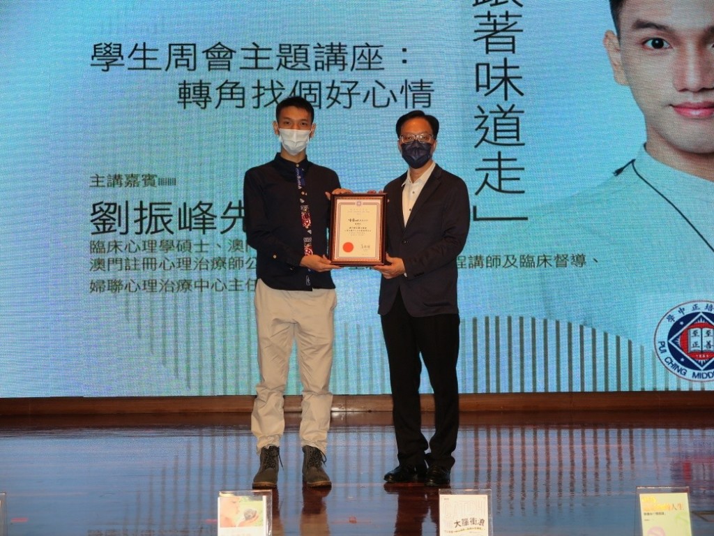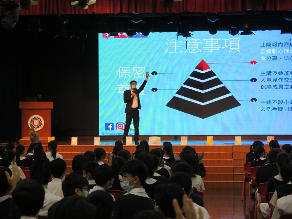 4月12、13日周會上,本校圖書館特邀婦聯心理治療中心劉振峰主任為初中師生主講真人圖書館 “轉角找個好心情” 主題講座,關顧師生的心靈需要,以愛同行。透過講座分享,讓大家從認知、情緒、心理及行為四個方面辨識青少年情緒低落與需要求助時的心理狀態。心理治療師帶大家就此問題深入淺出,並向師生介紹多種察覺情緒、轉換思想及改變行為等方法。當中也向師生推介社區資源,讓大家知悉求助渠道。在發問環節,劉振峰主任解答師生情緒方面的疑惑,師生均收穫豐富,獲益匪淺。