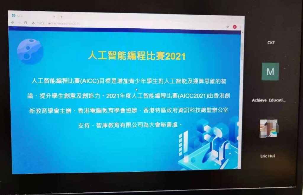 我校林秀蘭老師應香港創新教育學會、香港電腦教育學會的邀請,透過ZOOM,為香港賽區的「人工智能編程比賽(AICC)」的簡介會上作發言,分享我校同學早前囊括中小學組澳門區冠軍的比賽心得與收穫。