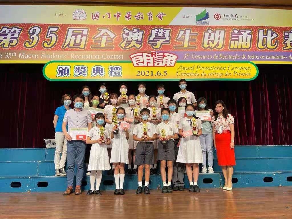 由澳門中華教育會主辦的「第三十五屆全澳學生朗誦比賽」頒獎典禮,今日下午假濠江中學舉行。本校學生參加各語種獨誦比賽,共獲四個特優獎、十五個一等獎、十個二等獎,成績優異。獲獎名單如下: