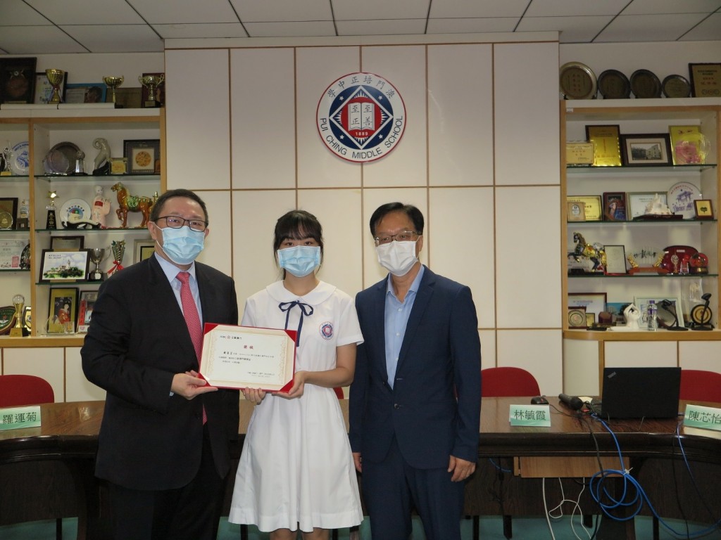 儀式上,高校長和工銀澳門陳錦聯副行政總裁一同頒發獲獎證書予獲獎同學。“工銀澳門基金獎”是為鼓勵長期參與商業知識競賽,以及即將到中國內地高等學府升讀金融、經濟等專業範疇的同學而設,獲獎同學有何梓為、何映霏、陳顥齊、李欣笑、蘇瑩芷、劉華睿、李靜然、黃文軒、鄭暉業和胡嘉葆。