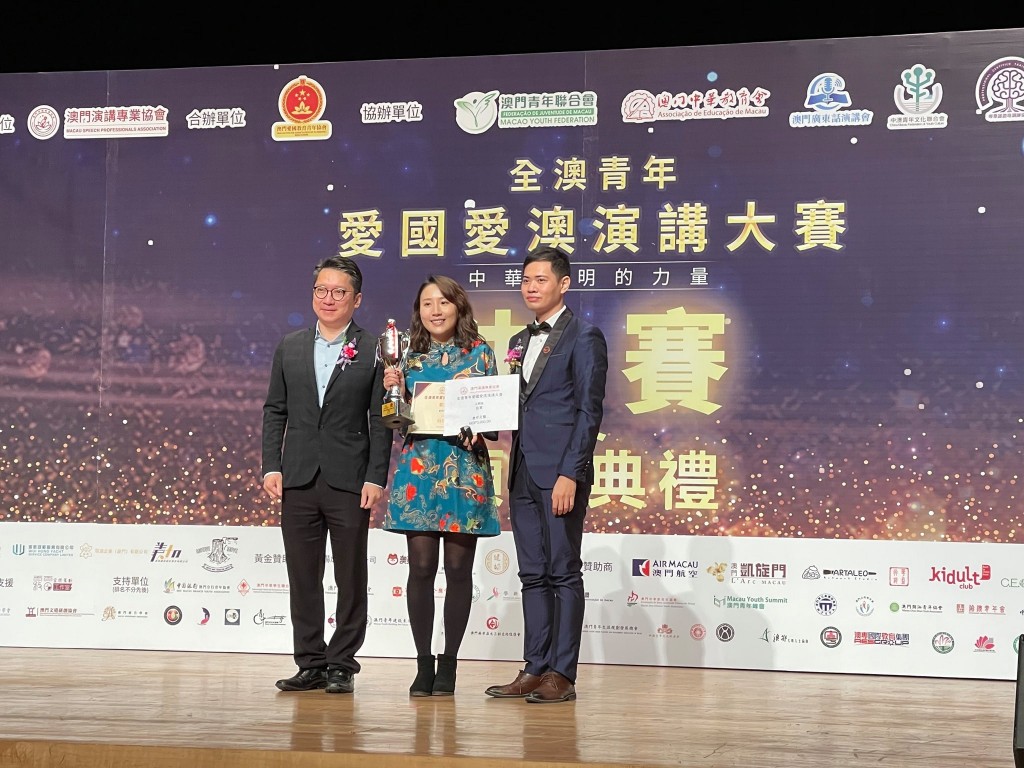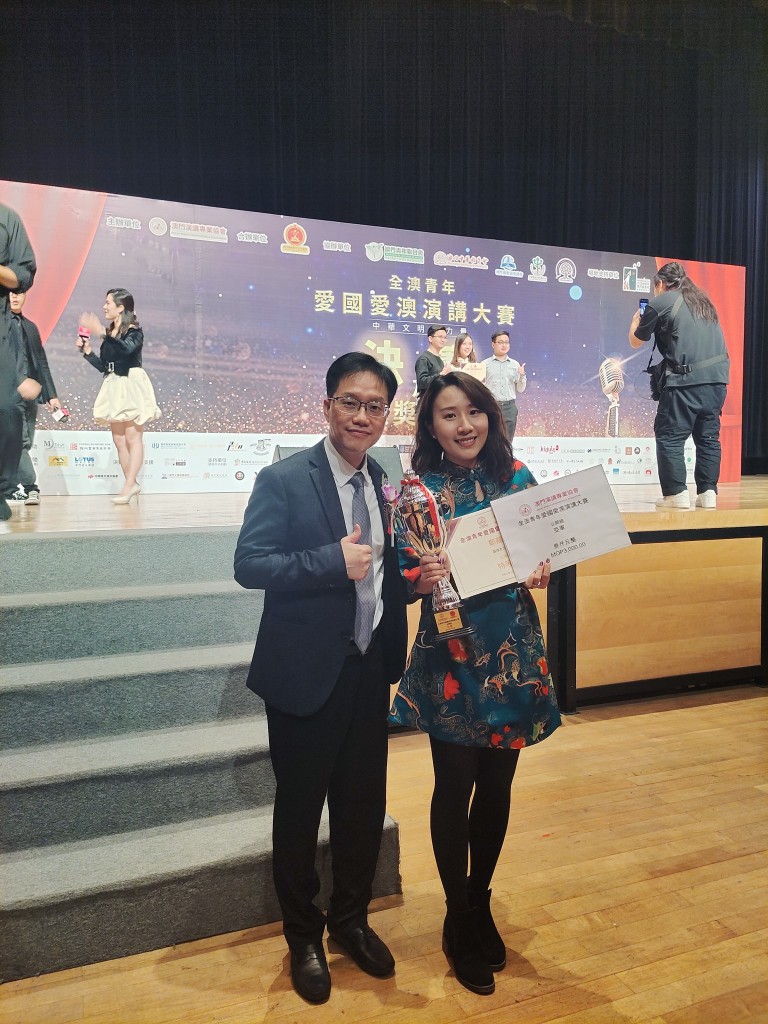 澳門演講專業協會首辦“全澳青年愛國愛澳演講比賽”,昨日於澳門旅遊塔四樓大劇院隆重舉行決賽及頒獎典禮。是次比賽以“中華文明的力量”為主題,多月來經過激烈的海選、複賽及決賽,本校鄭嘉麗老師獲得公開組亞軍。