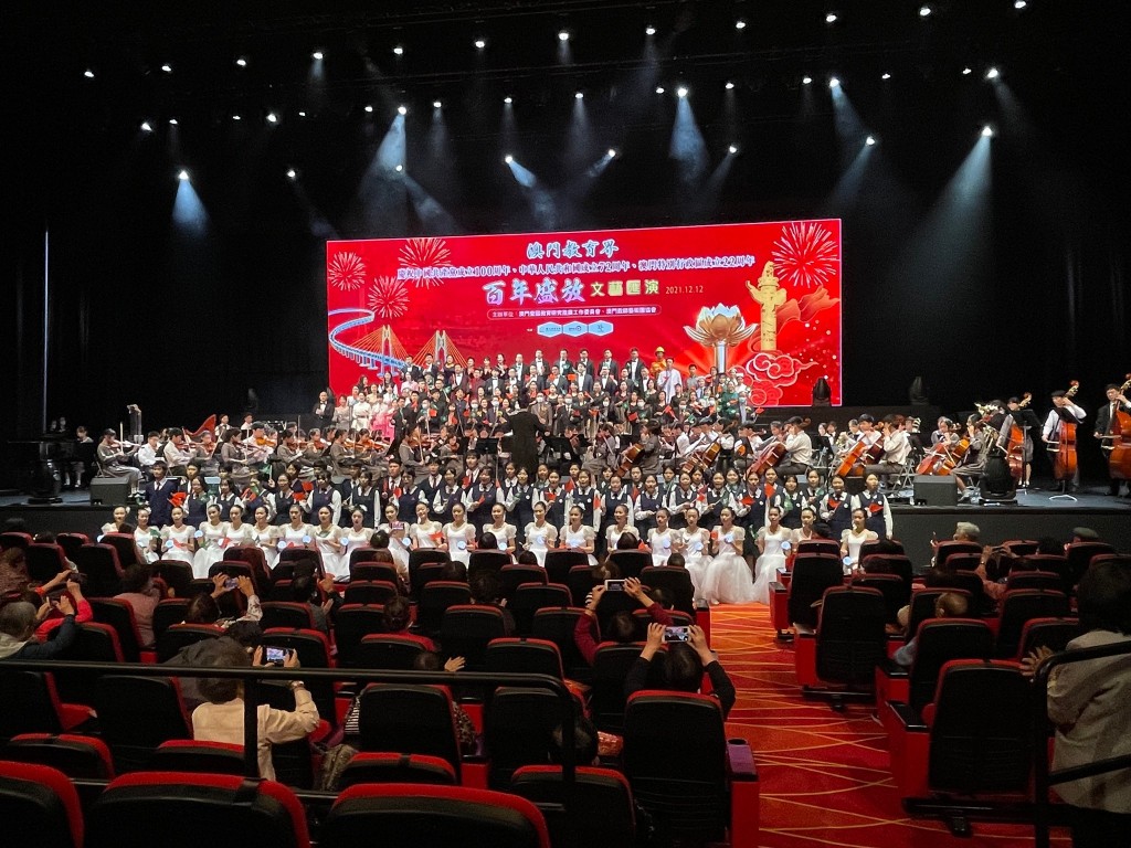 澳門愛國教育研究推廣工作委員會與澳門教師藝術團協會合辦“澳門教育界慶祝中國共產黨成立一百周年、新中國成立七十二周年、澳門特區成立廿二周年百年盛放文藝匯演”,於昨天下午假澳門銀河百老匯大舞台上演,節目豐富,與各界同賀三慶。本校何裕冠老師、葉健俊老師、譚重儀老師與各校老師攜手登台演出,展現澳門教師風采,充分體現教育界的大團結。