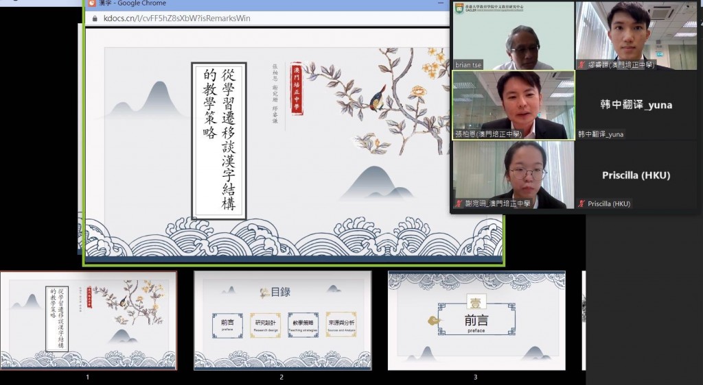 第十一屆漢字與漢字教育國際研討會於5月6日至7日在韓國以線上的形式舉行。我校張柏恩老師帶領高一善班謝宛珊和高一正班繆睿謙兩位同學,以線上形式參與了會議並一同發表學術論文。