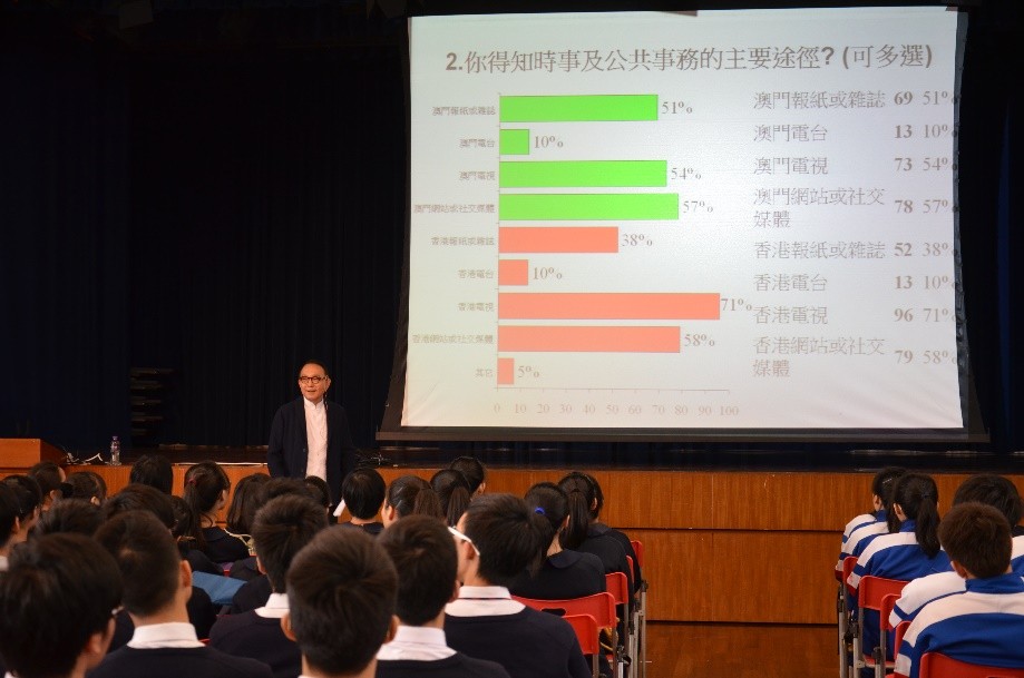 3月24日,澳門生產力暨科技轉移中心主席、澳門培正中學校董楊俊文博士蒞校,為高二、高三級同學舉行了一場有關升學與就業形勢講座,楊校董透過豐富的數據,積極的互動答問,引導學生思考如何提升競爭力去面對未來的挑戰。他認為情商(EQ)、正確的自我定位和創新能力是今日自我增值的重點。楊校董的演講風趣幽默,富啟發性,同學們深感獲益良多。