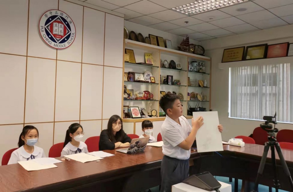 交流活動中,北海市第二實驗學校宣龍安老師宣講活動意義,介紹了廣西綠色環保開展情況;本校視覺藝術科科主任黃慧儀簡述了澳門綠色環保推行狀況,分享本校做為全國首間零碳學校試點單位的實踐。兩校學生交流作品創作理念,暢談對環保、零碳公民的思考與展望,並即時修改作品,互相交流學習。