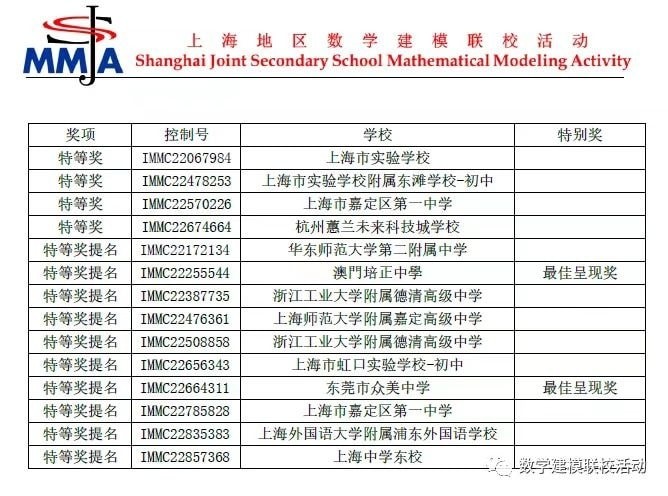 第四屆上海地區數學建模聯校活動(SJMMA2022)海報展示與答辯於5月23-29日在線上成功舉辦。我校高一年級應用科學組別光班吳宜臻、何卓謙、魏智誠,高一文組善班江禧源,經歷問題提出、組委會遴選與修改問題、學生問題解決與論文撰寫、學生海報與食品製作、線上海報評審與線上答辯六個階段。從8010名參賽選手中脫穎而出,其中匿名提交的建模論文進入328支隊伍前六,獲得“特等獎提名”,並在答辯環節獲得“最佳呈現獎”。是次活動參賽者需從賽委會給定的6題選擇1題建模作答,問題全部來自社會經濟生活領域。我校應用科學組別的課程設置,學以致用,效果明顯。