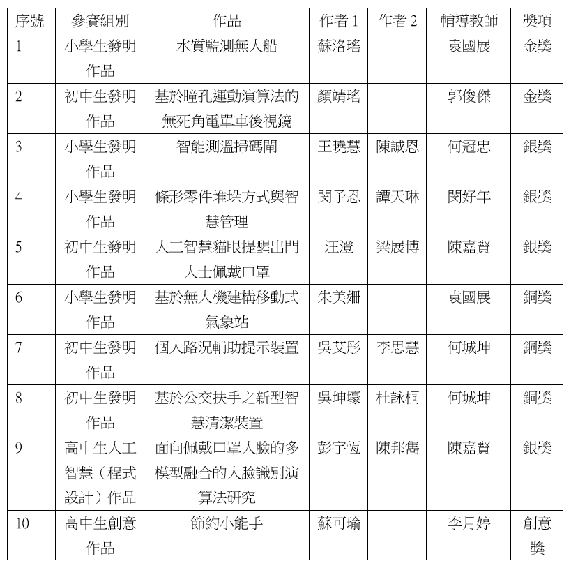 本校共有8項發明作品、1項人工智能作品及1項創意作品入圍終評,經過三天的線上答辯後,發明作品獲2金3銀3銅,人工智能作品獲得1銀,創意作品獲創意作品獎。詳細獲獎名單見附表。