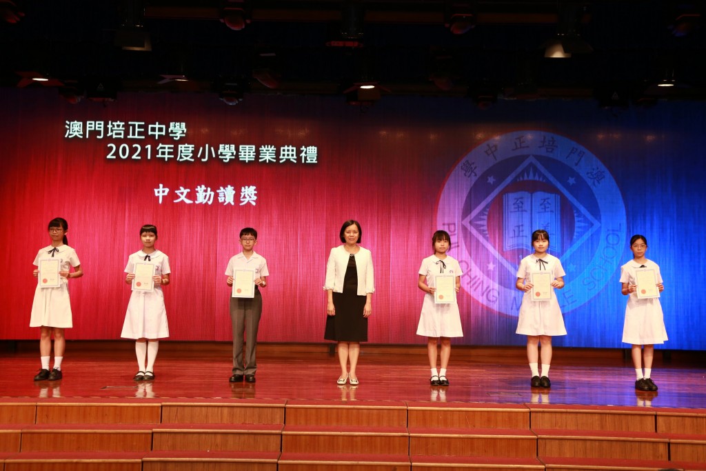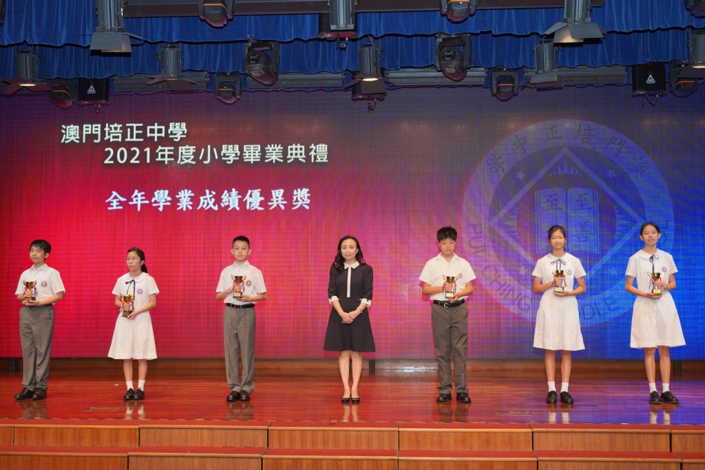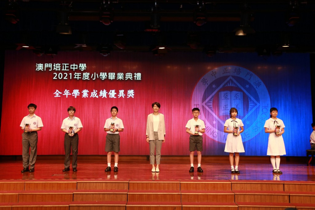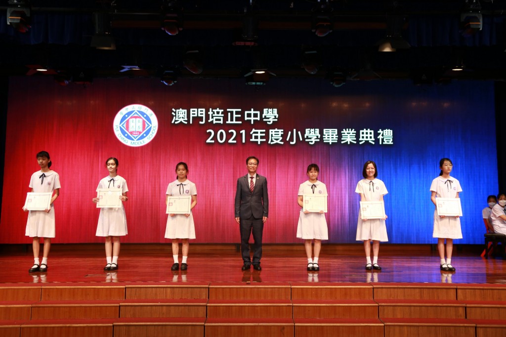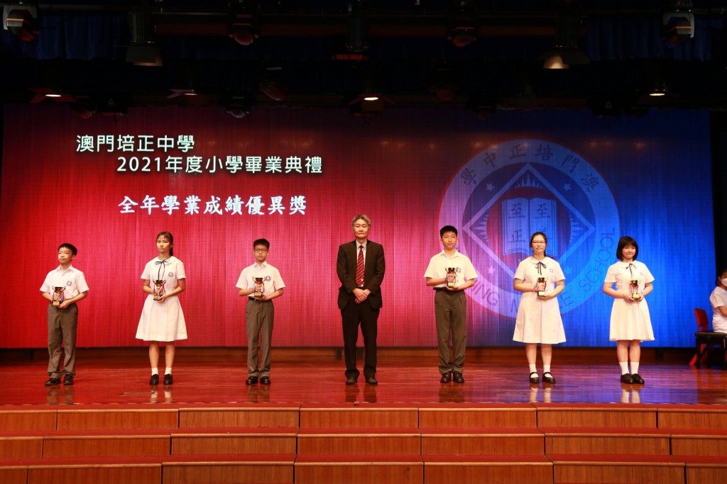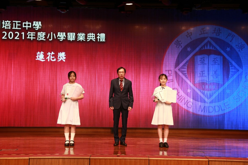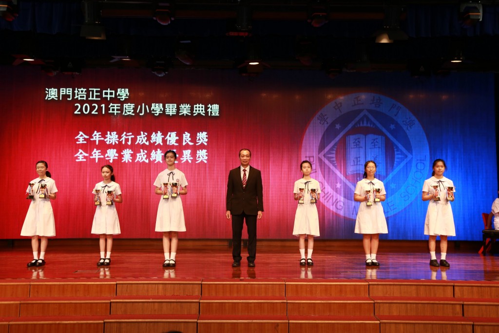 隨後,高錦輝校長為小六畢業生頒發畢業證書。高錦輝校長、澳門培正同學會會長黃漢堅校董等主禮人向優秀畢業生和本學年參加全國性或國際性比賽,並有突出表現的同學,頒發各項獎品和獎學金。高錦輝校長、郭敬文副校長、陳敬濂副校長和楊珮欣副校長向長期服務及榮休的教職員致送紀念座。