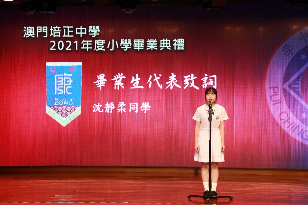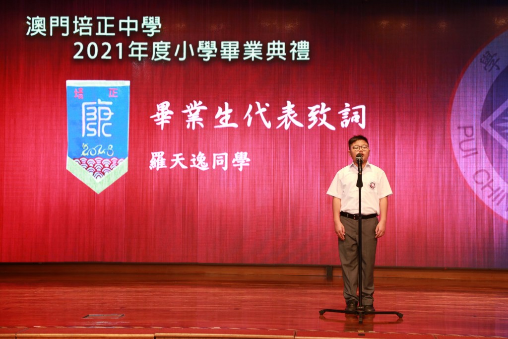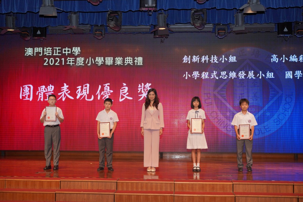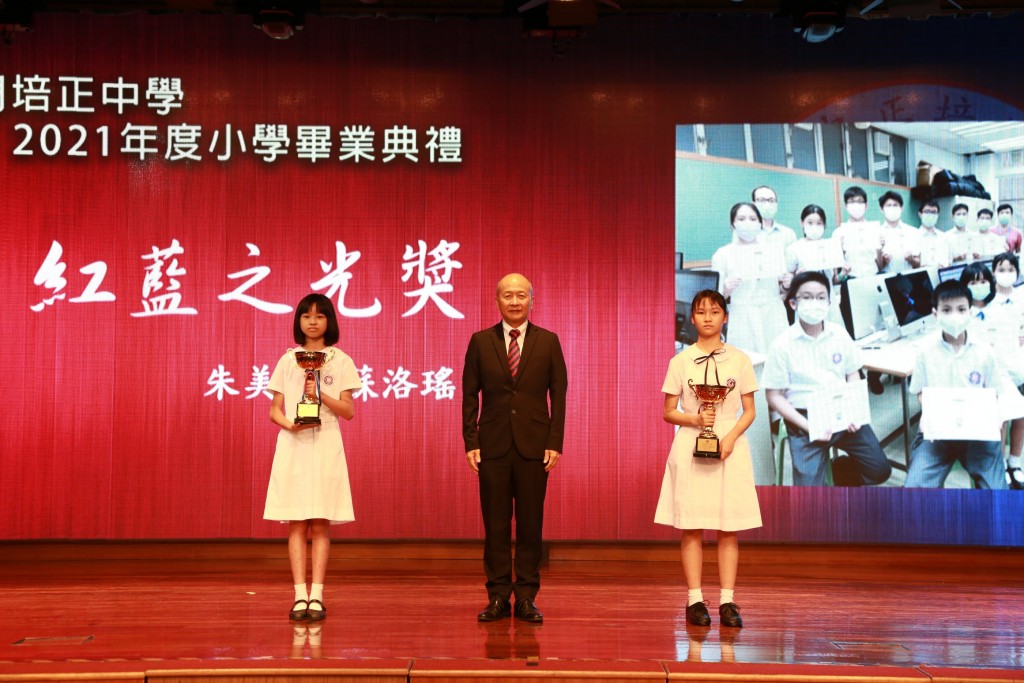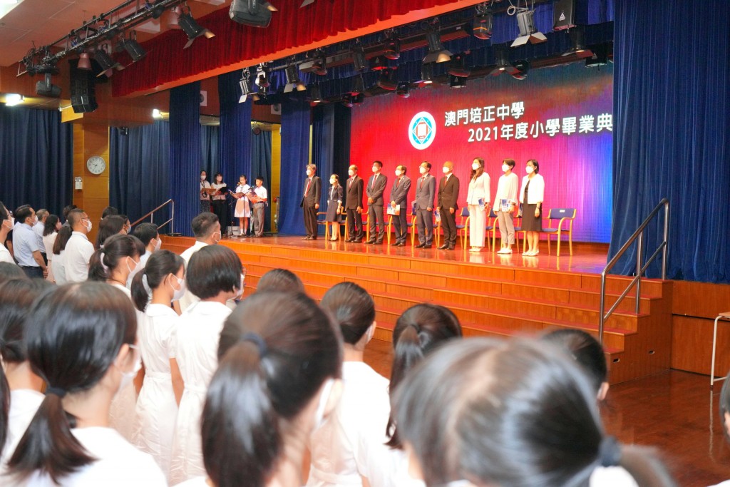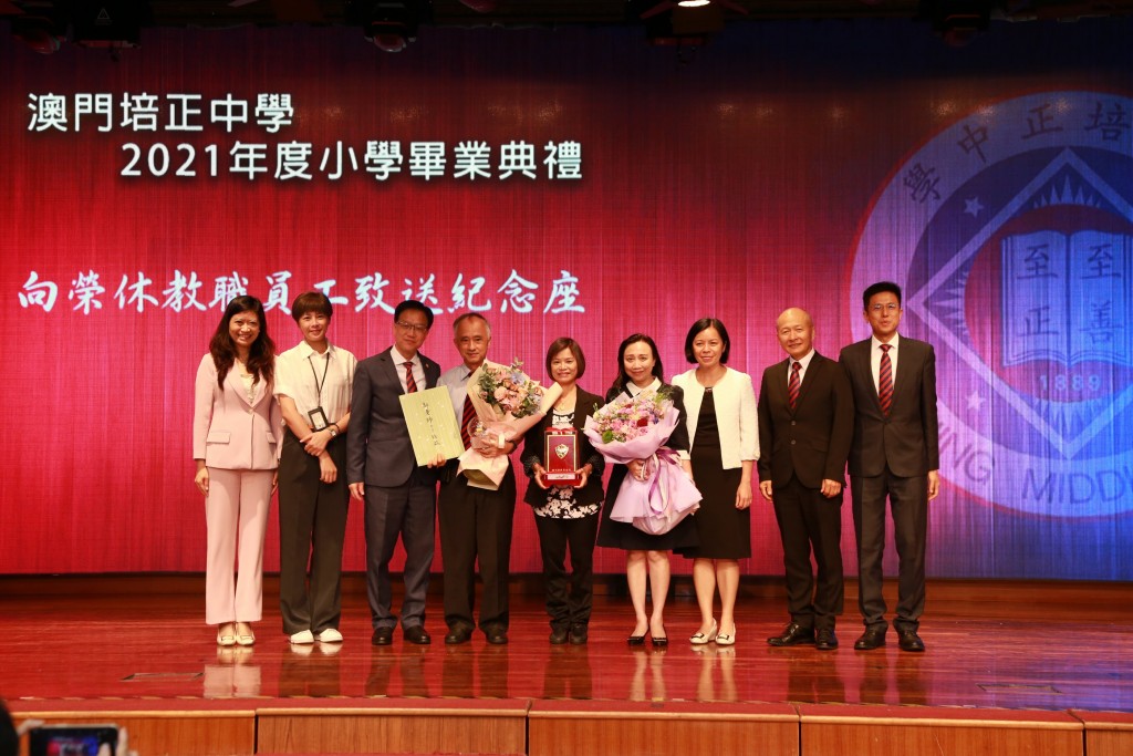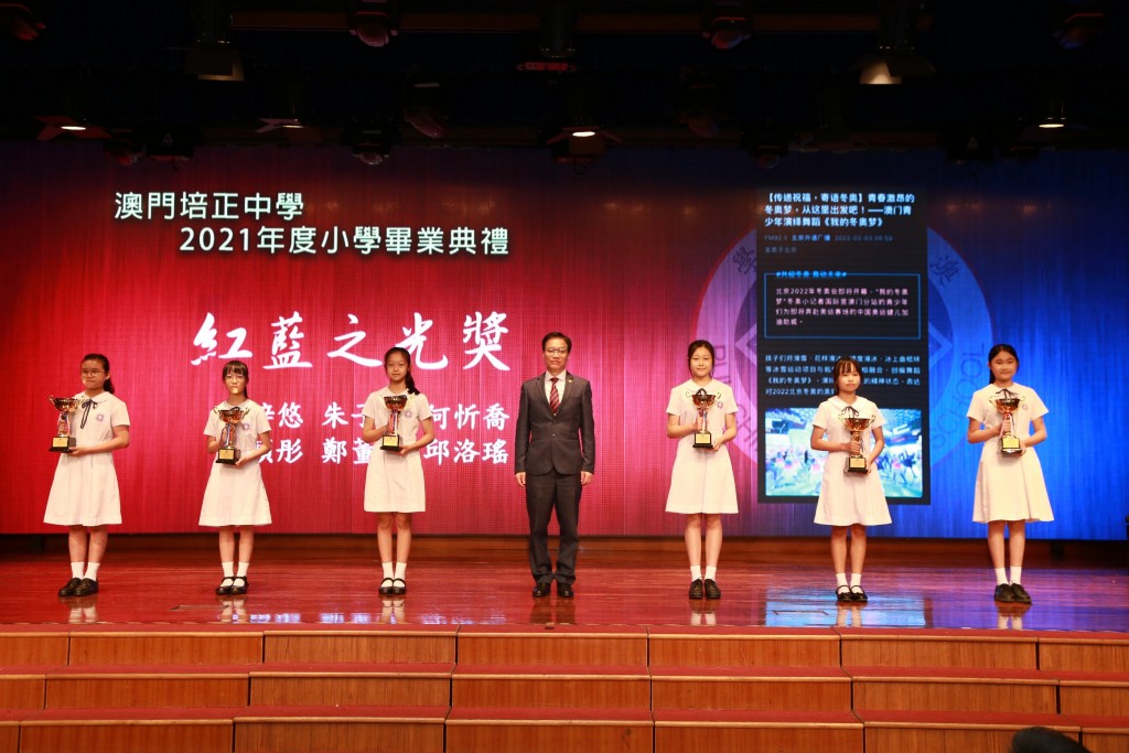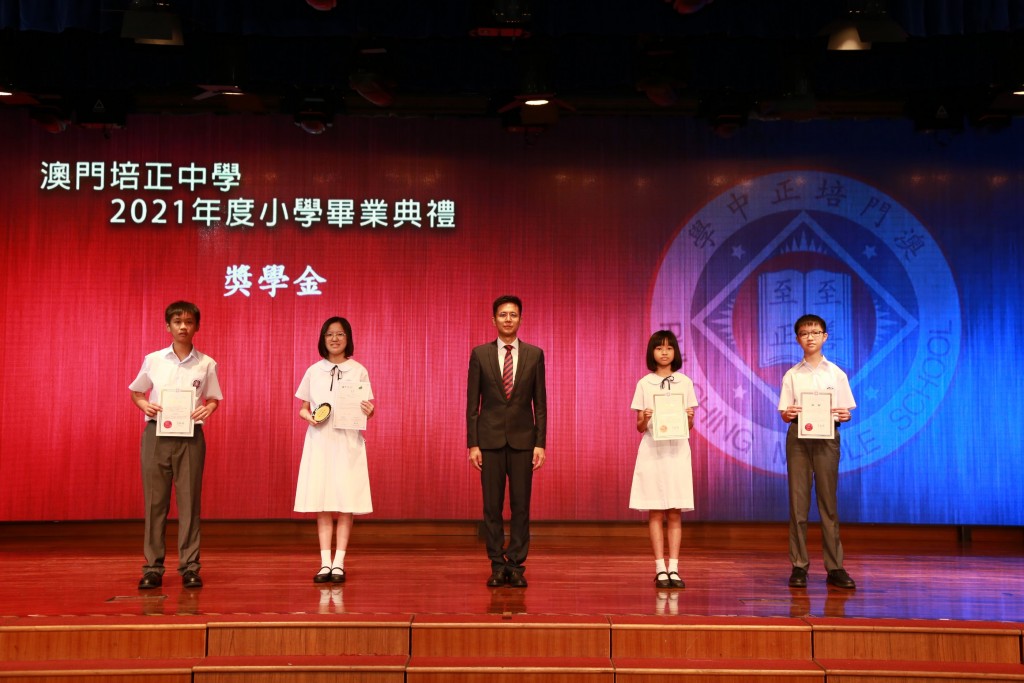 隨後,高錦輝校長為小六畢業生頒發畢業證書。高錦輝校長、澳門培正同學會會長黃漢堅校董等主禮人向優秀畢業生和本學年參加全國性或國際性比賽,並有突出表現的同學,頒發各項獎品和獎學金。高錦輝校長、郭敬文副校長、陳敬濂副校長和楊珮欣副校長向長期服務及榮休的教職員致送紀念座。