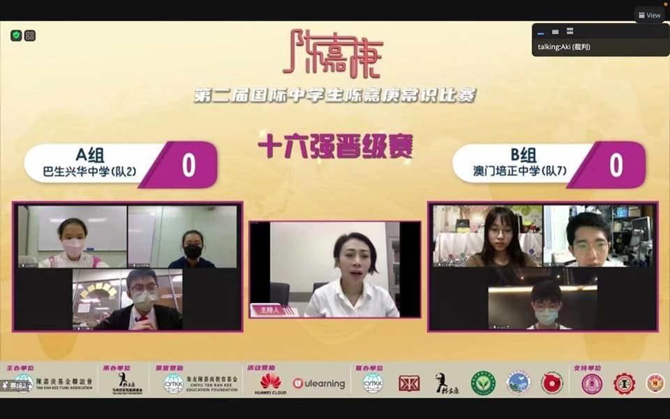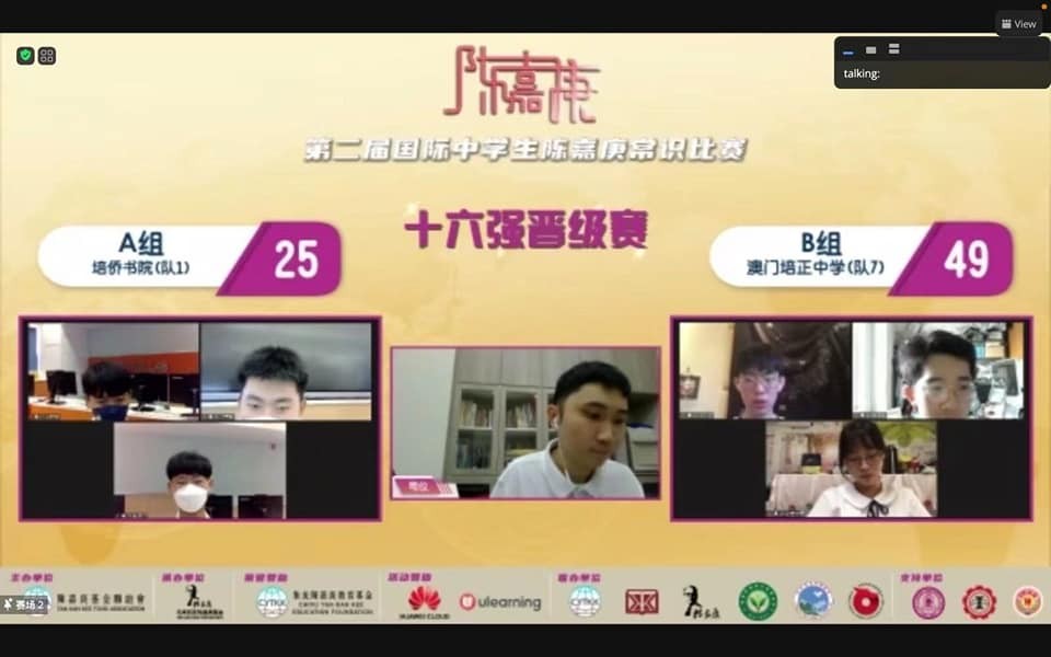 本校高中學生譚貯文、張若詩、梁正朗、黃浩政,及校友翟夏木組成的「澳門培正7隊」,在我校歷史科鍾春暉、張海珊老師的帶領,參加“陳嘉庚國際中學生常識比賽”。經過兩個月來經歷多番鏖戰,最終止步八強,是澳門目前參與該國際比賽最好的成績,雖敗猶榮。本屆比賽共有227支隊伍,1135名來自中國內地、中國香港、中國澳門、馬來西亞和菲律賓等多個國家和地區參與。我校一共派出12隊參與,其中鍾子程老師帶領的「培正4隊」也進入了十六強。