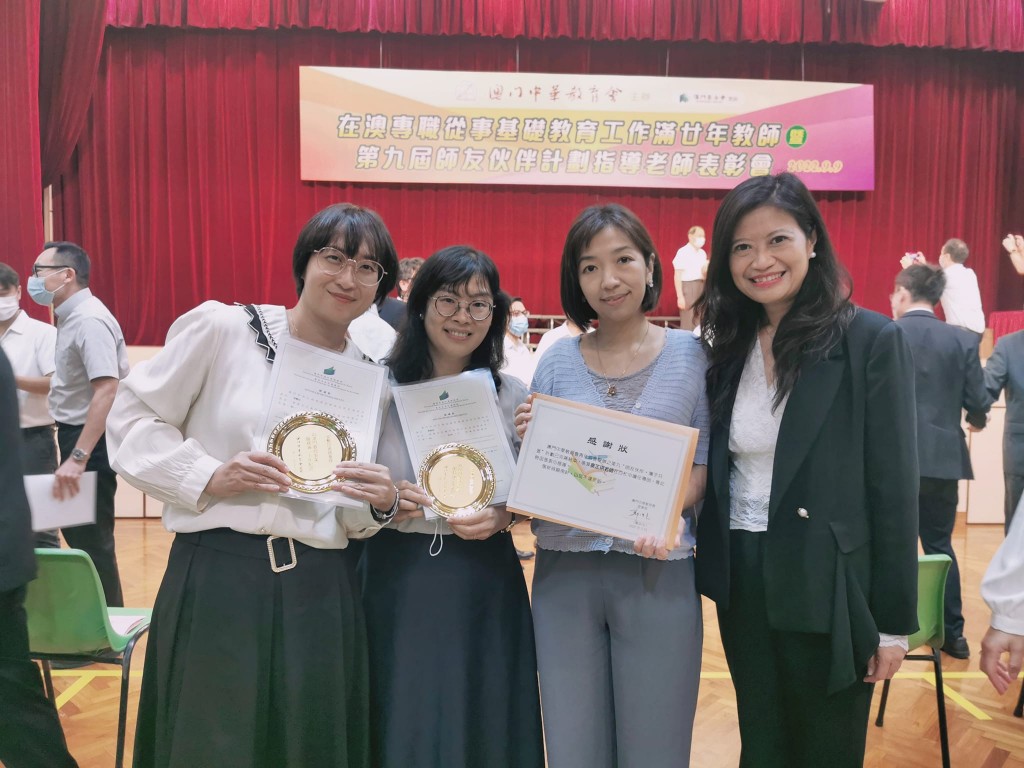 春風化雨,作育英才。本校郭艷玲老師、蔡毓瑜老師今晚出席由澳門中華教育會舉辦的「在澳專職從事基礎教育工作滿廿年教師暨第九屆師友伙伴計劃指導老師表彰會」,獲頒在澳門專職從事教育工作屆滿廿年的教師感謝狀。另外,本校麥芷琪老師、葉健俊老師於表彰儀式中獲頒“第九屆師友伙伴攜手共進”計劃之指導老師感謝狀。
